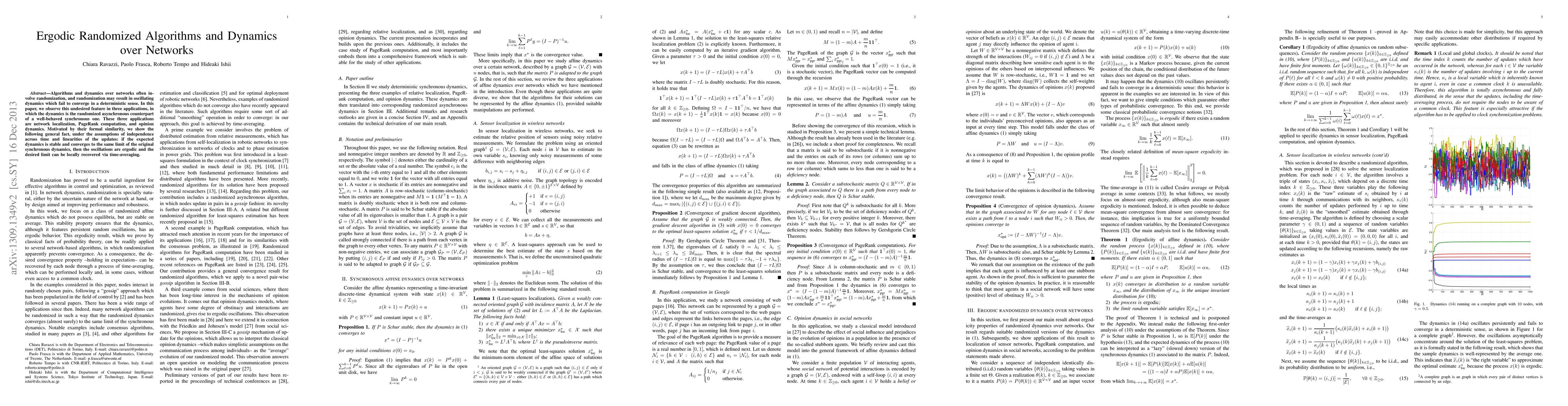 Algorithms and dynamics over networks often involve randomization, and randomization may result in oscillating dynamics which fail to converge in a deterministic sense. In this paper, we observe this undesired feature in three applications, in which the dynamics is the randomized asynchronous counterpart of a well-behaved synchronous one. These three applications are network localization, PageRank computation, and opinion dynamics. Motivated by their formal similarity, we show the following general fact, under the assumptions of independence across time and linearities of the updates: if the expected dynamics is stable and converges to the same limit of the original synchronous dynamics, then the oscillations are ergodic and the desired limit can be locally recovered via time-averaging.