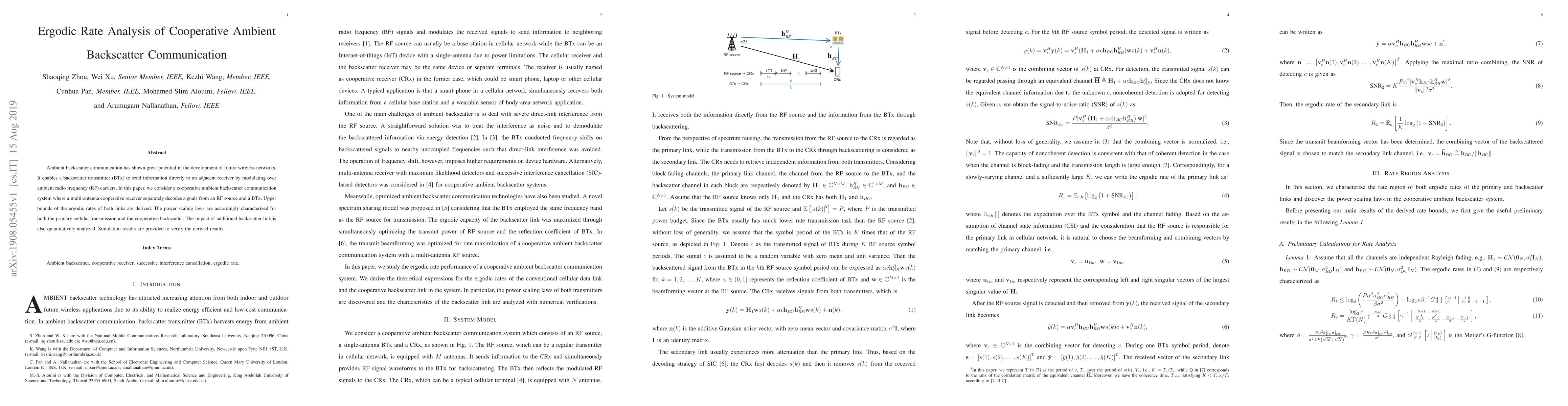 Ambient backscatter communication has shown great potential in the development of future wireless networks. It enables a backscatter transmitter (BTx) to send information directly to an adjacent receiver by modulating over ambient radio frequency (RF) carriers. In this paper, we consider a cooperative ambient backscatter communication system where a multi-antenna cooperative receiver separately decodes signals from an RF source and a BTx. Upper bounds of the ergodic rates of both links are derived. The power scaling laws are accordingly characterized for both the primary cellular transmission and the cooperative backscatter. The impact of additional backscatter link is also quantitatively analyzed. Simulation results are provided to verify the derived results.