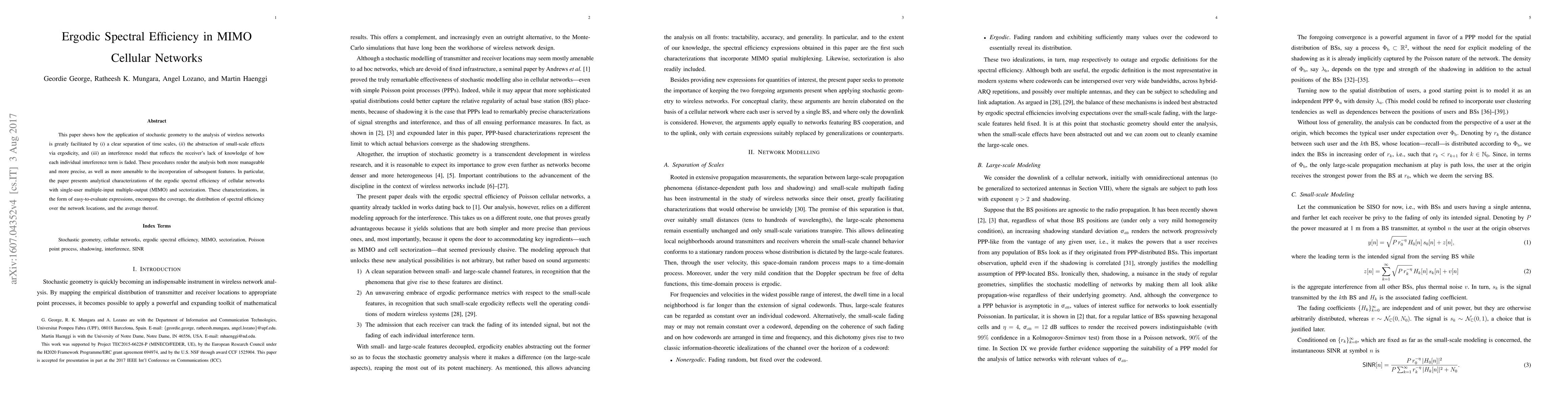 This paper shows how the application of stochastic geometry to the analysis of wireless networks is greatly facilitated by (i) a clear separation of time scales, (ii) the abstraction of small-scale effects via ergodicity, and (iii) an interference model that reflects the receiver's lack of knowledge of how each individual interference term is faded. These procedures render the analysis both more manageable and more precise, as well as more amenable to the incorporation of subsequent features. In particular, the paper presents analytical characterizations of the ergodic spectral efficiency of cellular networks with single-user multiple-input multiple-output (MIMO) and sectorization. These characterizations, in the form of easy-to-evaluate expressions, encompass the coverage, the distribution of spectral efficiency over the network locations, and the average thereof.