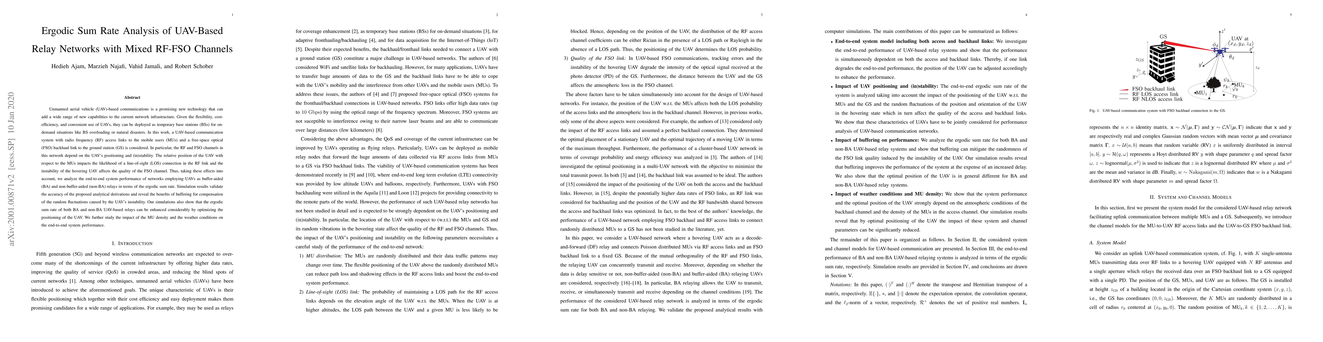 This paper analyzes the ergodic sum rate of UAV-based relay networks with mixed RF and FSO channels, considering the impact of UAV positioning and stability. It finds that buffer-aided relays can mitigate the effects of UAV instability, and optimal UAV positioning significantly enhances network performance.