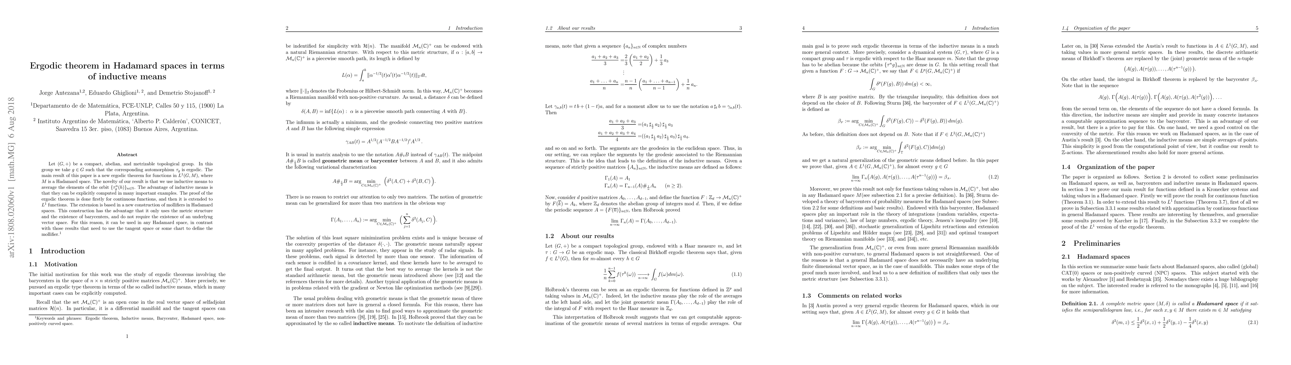 Let (G,+) be a compact, abelian, and metrizable topological group. In this group we take $g\in G$ such that the corresponding automorphism t_g is ergodic. The main result of this paper is a new ergodic theorem for functions in L^1(G,M), where M is a Hadamard space. The novelty of our result is that we use inductive means to average the elements of the orbit {t_g^n(h)}_{n\in N}. The advantage of inductive means is that they can be explicitly computed in many important examples. The proof of the ergodic theorem is done firstly for continuous functions, and then it is extended to L^1 functions. The extension is based in a new construction of mollifiers in Hadamard spaces. This construction has the advantage that it only uses the metric structure and the existence of barycenters, and do not require the existence of an underlying vector space. For this reason, it can be used in any Hadamard space, in contrast with those results that need to use the tangent space or some chart to define the mollifier.
