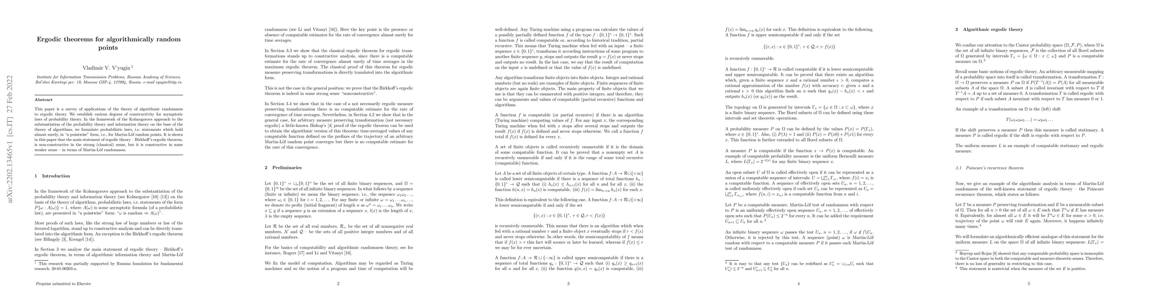 This paper surveys the application of algorithmic randomness to ergodic theory, establishing constructivity for asymptotic laws in probability theory. It demonstrates that while the Birkhoff ergodic theorem is non-constructive classically, it is constructively valid for Martin-Lof random points.