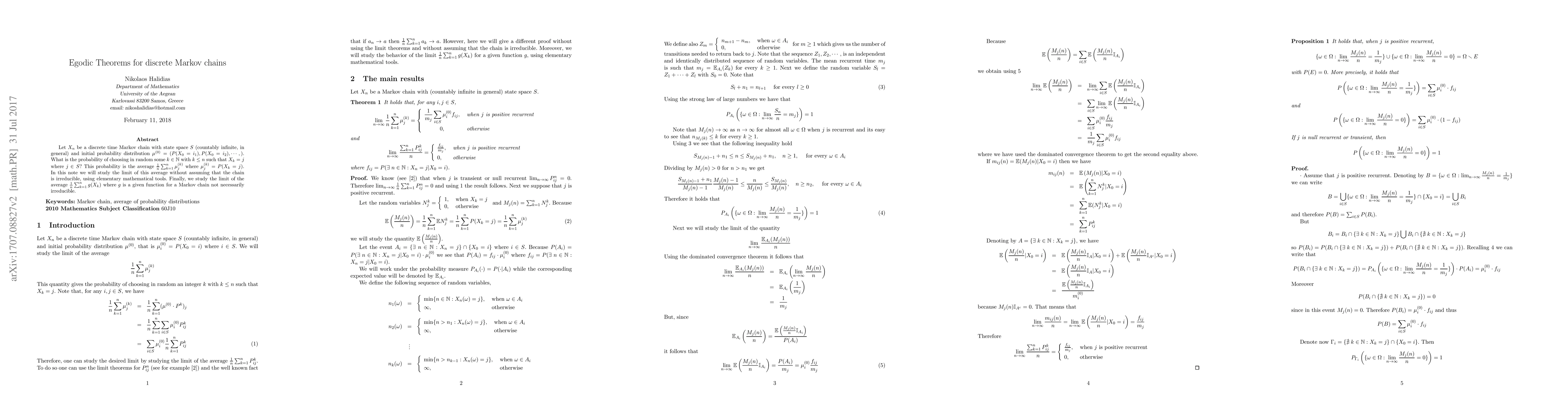This paper explores the limit of the average probability of reaching a specific state in a discrete Markov chain over many steps, without assuming irreducibility. It provides elementary mathematical tools to study this limit for both general functions g(X_k) and specifically P(X_k = j).