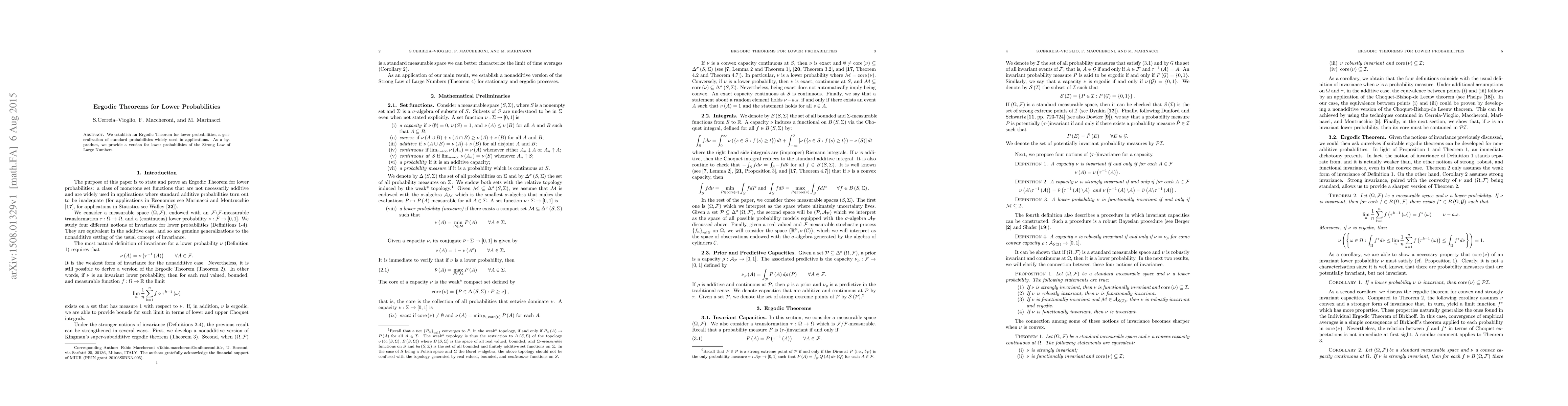 This paper establishes an Ergodic Theorem for lower probabilities, a generalization of standard probabilities, with implications for the Strong Law of Large Numbers.