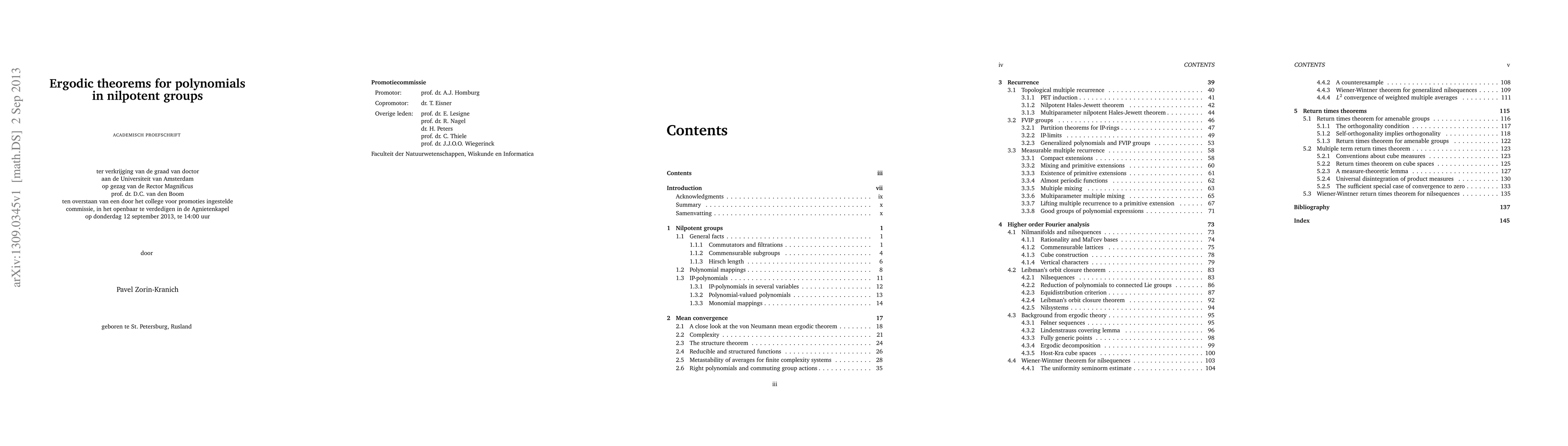 The principal results proved in this expository thesis are the IP polynomial Szemer\'edi theorem for nilpotent groups and the multiple term return times theorem with nilsequence weights. It also contains extensions of the convergence theorem for nilpotent polynomial multiple ergodic averages and the return times theorem to locally compact second countable amenable groups.