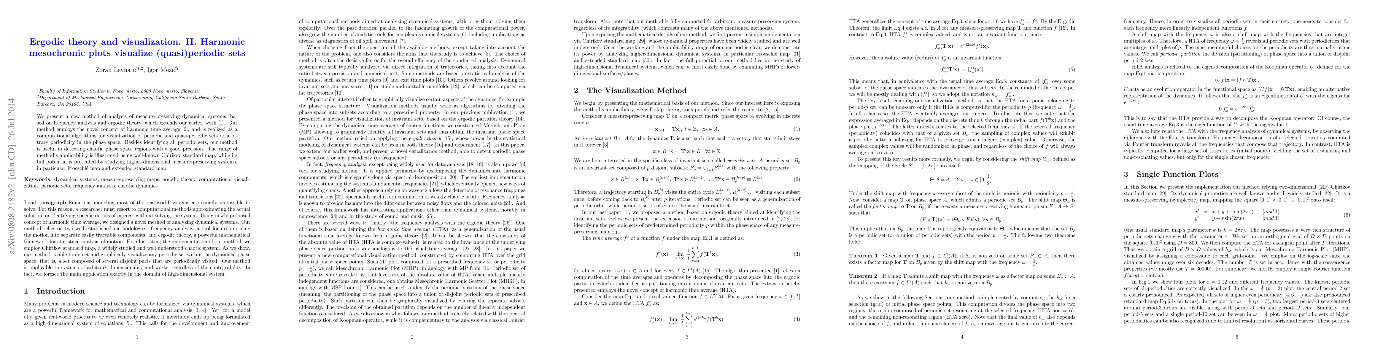 We present a new method of analysis of measure-preserving dynamical systems, based on frequency analysis and ergodic theory, which extends our earlier work [1]. Our method employs the novel concept of harmonic time average [2], and is realized as a computational algorithms for visualization of periodic and quasi-periodic sets or arbitrary periodicity in the phase space. Besides identifying all periodic sets, our method is useful in detecting chaotic phase space regions with a good precision. The range of method's applicability is illustrated using well-known Chirikov standard map, while its full potential is presented by studying higher-dimensional measure-preserving systems, in particular Froeschl\'e map and extended standard map.