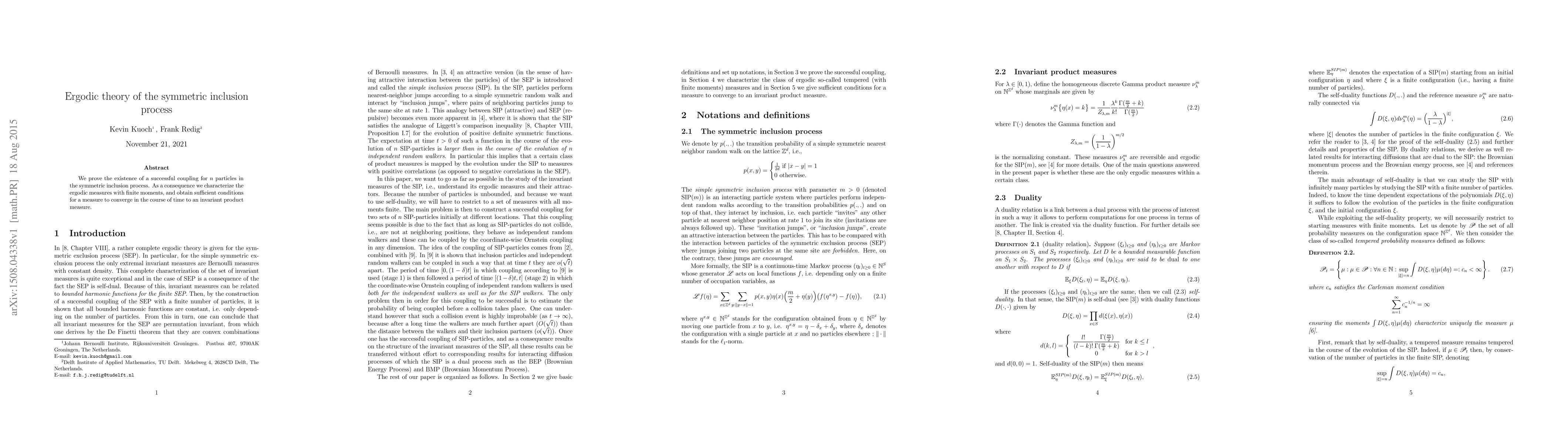 This paper proves the existence of a successful coupling for $n$ particles in the symmetric inclusion process, leading to a characterization of ergodic measures with finite moments and sufficient conditions for convergence to an invariant product measure over time.