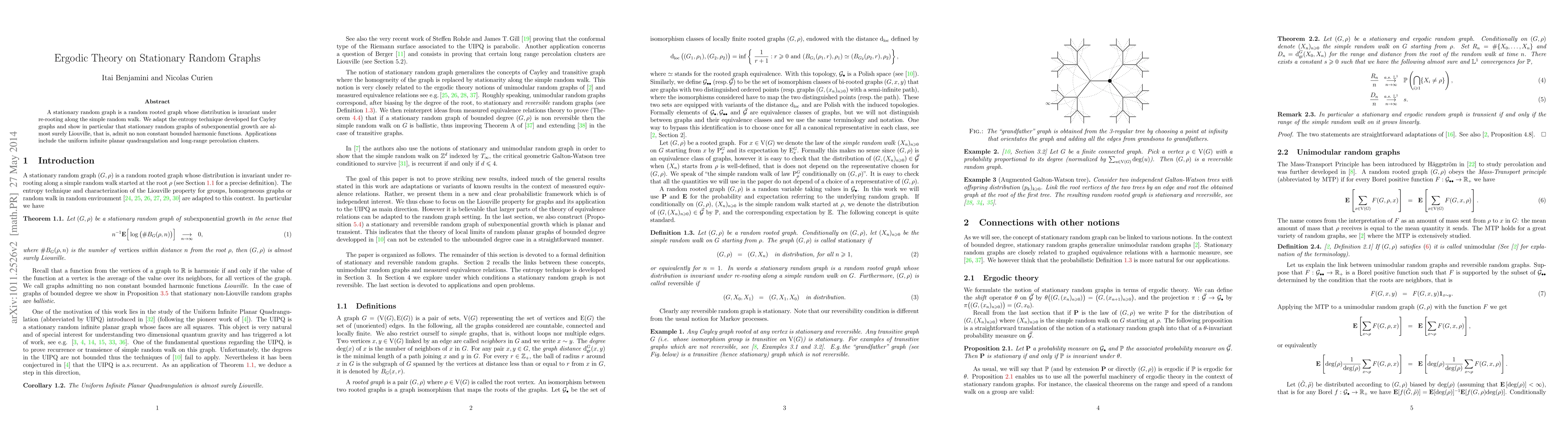 A stationary random graph is a random rooted graph whose distribution is invariant under re-rooting along the simple random walk. We adapt the entropy technique developed for Cayley graphs and show in particular that stationary random graphs of subexponential growth are almost surely Liouville, that is, admit no non constant bounded harmonic function. Applications include the uniform infinite planar quadrangulation and long-range percolation clusters.