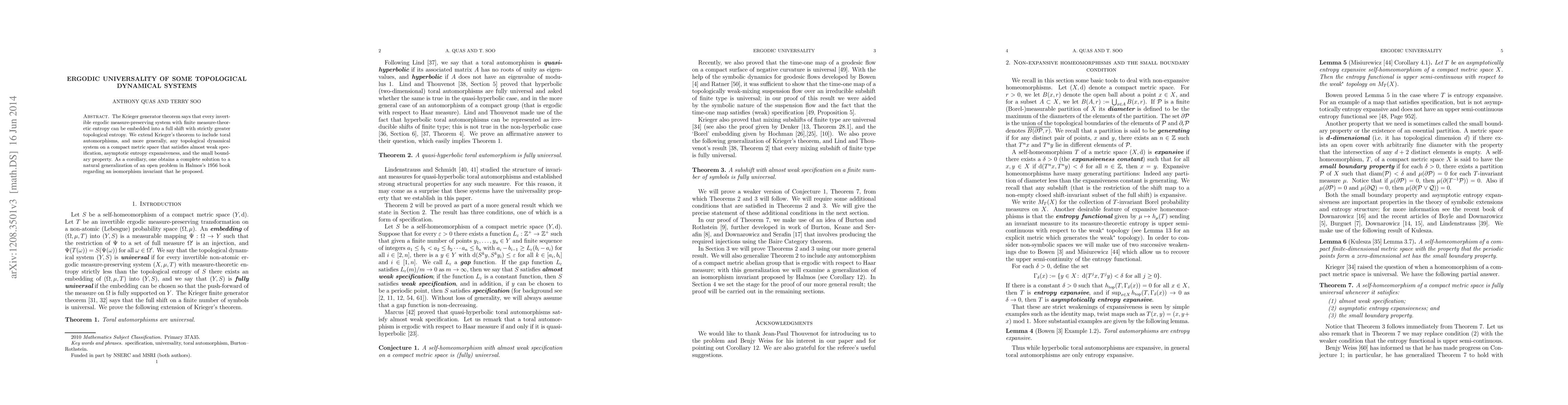 The Krieger generator theorem says that every invertible ergodic measure-preserving system with finite measure-theoretic entropy can be embedded into a full shift with strictly greater topological entropy. We extend Krieger's theorem to include toral automorphisms, and more generally, any topological dynamical system on a compact metric space that satisfies almost weak specification, asymptotic entropy expansiveness, and the small boundary property. As a corollary, one obtains a complete solution to a natural generalization of an open problem in Halmos's 1956 book regarding an isomorphism invariant that he proposed.