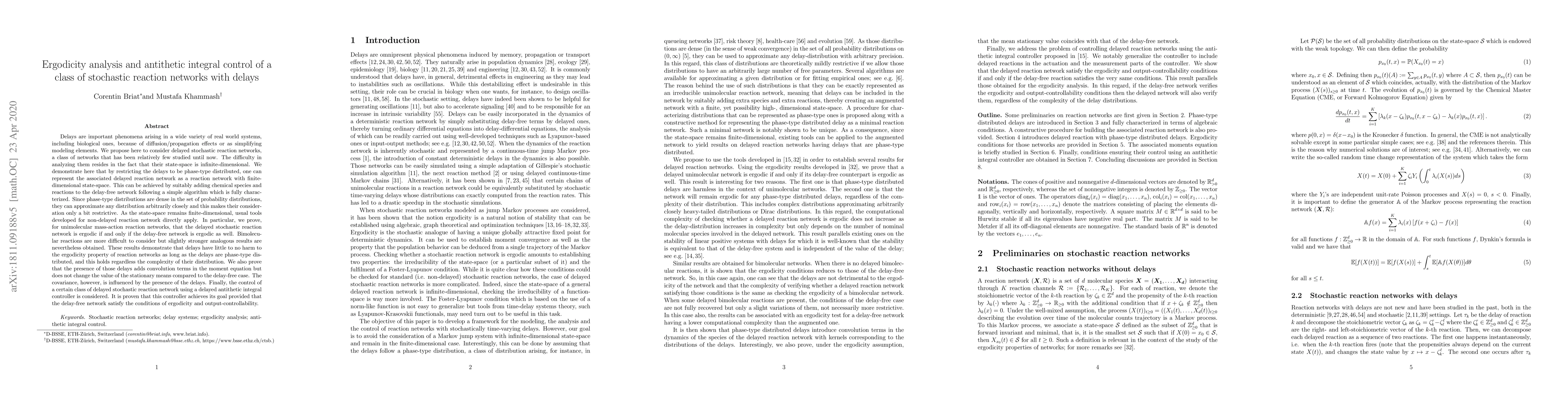 Delays are an important phenomenon arising in a wide variety of real world systems. They occur in biological models because of diffusion effects or as simplifying modeling elements. We propose here to consider delayed stochastic reaction networks. The difficulty here lies in the fact that the state-space of a delayed reaction network is infinite-dimensional, which makes their analysis more involved. We demonstrate here that a particular class of stochastic time-varying delays, namely those that follow a phase-type distribution, can be exactly implemented in terms of a chemical reaction network. Hence, any delay-free network can be augmented to incorporate those delays through the addition of delay-species and delay-reactions. Hence, for this class of stochastic delays, which can be used to approximate any delay distribution arbitrarily accurately, the state-space remains finite-dimensional and, therefore, standard tools developed for standard reaction network still apply. In particular, we demonstrate that for unimolecular mass-action reaction networks that the delayed stochastic reaction network is ergodic if and only if the non-delayed network is ergodic as well. Bimolecular reactions are more difficult to consider but an analogous result is also obtained. These results tell us that delays that are phase-type distributed, regardless of their distribution, are not harmful to the ergodicity property of reaction networks. We also prove that the presence of those delays adds convolution terms in the moment equation but does not change the value of the stationary means compared to the delay-free case. Finally, the control of a certain class of delayed stochastic reaction network using a delayed antithetic integral controller is considered. It is proven that this controller achieves its goal provided that the delay-free network satisfy the conditions of ergodicity and output-controllability.