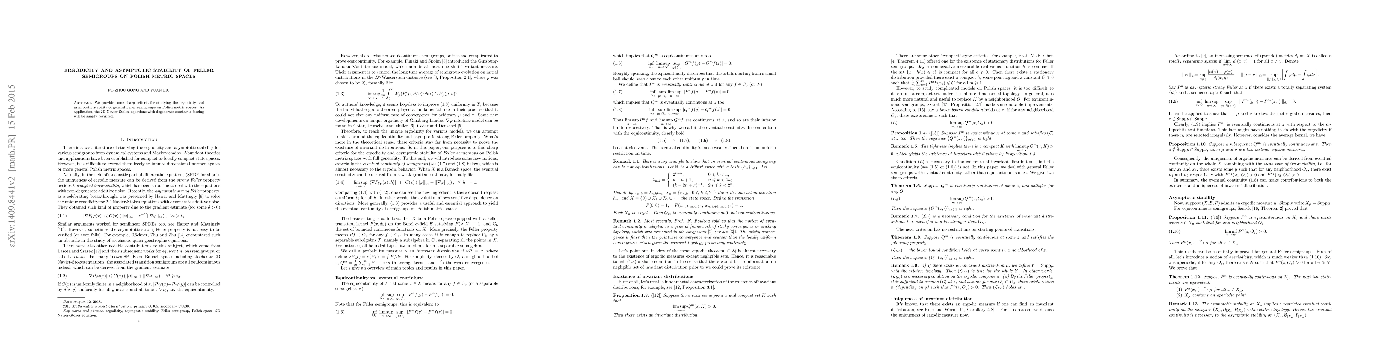 Summary: This paper establishes precise criteria for the ergodicity and asymptotic stability of Feller semigroups on Polish metric spaces, with a specific application to revisiting the 2D Navier-Stokes equations with stochastic forcing.