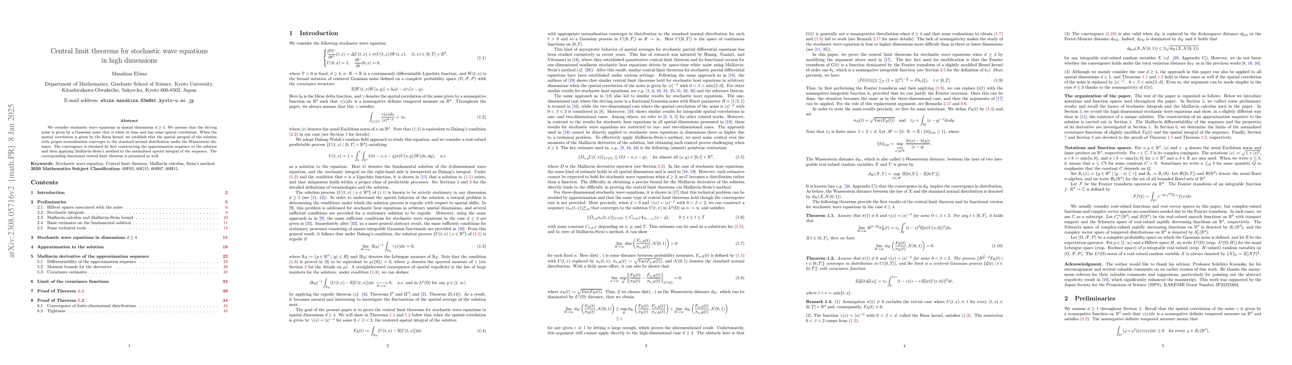 This paper investigates stochastic wave equations in high dimensions ($d \geq 4$) driven by Gaussian noise, proving spatial ergodicity and establishing a functional central limit theorem using Malliavin calculus and the Riesz kernel. It demonstrates convergence of the normalized spatial integral to the standard normal distribution under the Wasserstein distance.
