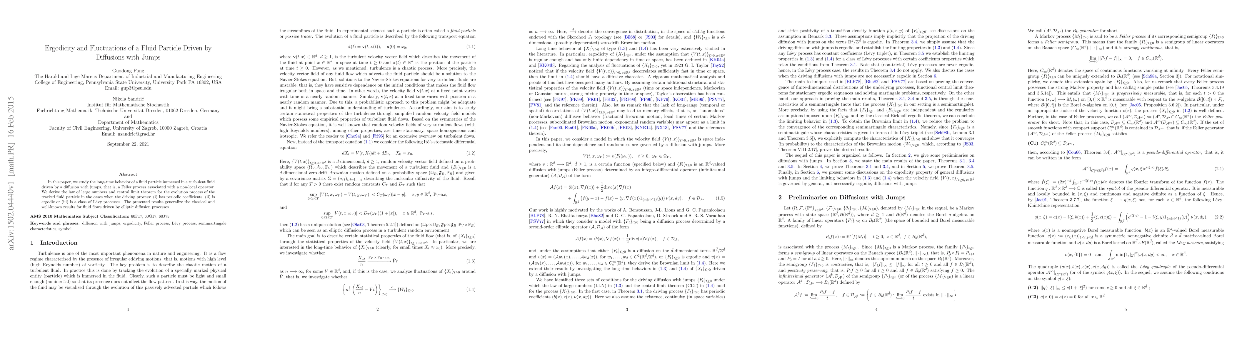 This paper investigates the long-term behavior of a fluid particle in turbulent fluid driven by a diffusion with jumps, deriving the law of large numbers and central limit theorem under various conditions on the driving process, including periodic coefficients, ergodicity, and Lévy processes. The results extend classical findings for fluid flows driven by elliptic diffusions.