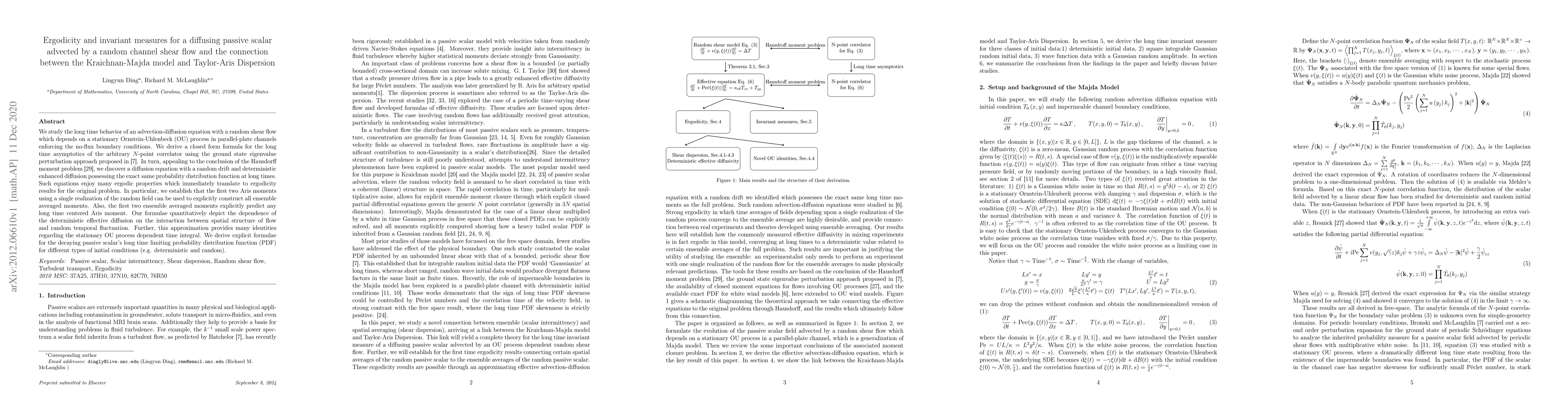 We study the long time behavior of an advection-diffusion equation with a random shear flow which depends on a stationary Ornstein-Uhlenbeck (OU) process in parallel-plate channels enforcing the no-flux boundary conditions. We derive a closed form formula for the long time asymptotics of the arbitrary $N$-point correlator using the ground state eigenvalue perturbation approach proposed in \cite{bronski1997scalar}. In turn, appealing to the conclusion of the Hausdorff moment problem \cite{shohat1943problem}, we discover a diffusion equation with a random drift and deterministic enhanced diffusion possessing the exact same probability distribution function at long times. Such equations enjoy many ergodic properties which immediately translate to ergodicity results for the original problem. In particular, we establish that the first two Aris moments using a single realization of the random field can be used to explicitly construct all ensemble averaged moments. Also, the first two ensemble averaged moments explicitly predict any long time centered Aris moment. Our formulae quantitatively depict the dependence of the deterministic effective diffusion on the interaction between spatial structure of flow and random temporal fluctuation. This noteably contrasts the white noise case from the OU case. Further, this approximation provides many identities regarding the stationary OU process dependent time integral. We derive explicit formulae for the decaying passive scalar's long time limiting probability distribution function (PDF) for different types of initial conditions (e.g. deterministic and random). All results are verified by Monte-Carlo simulations.