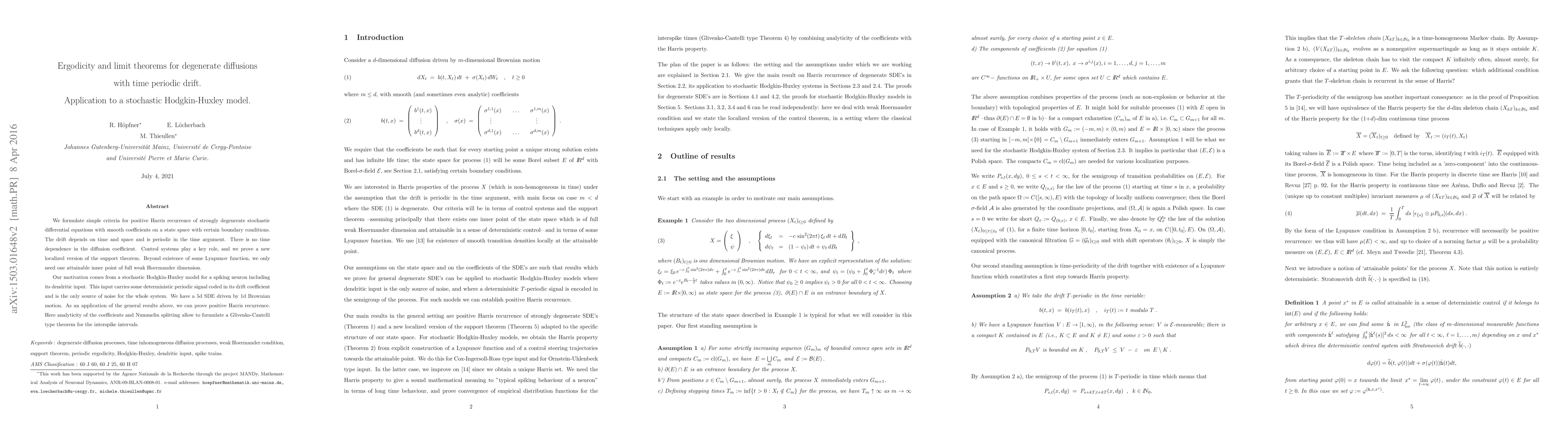 This paper establishes criteria for positive Harris recurrence in strongly degenerate stochastic differential equations with time-periodic drift, proving limit theorems for such systems. An application to a stochastic Hodgkin-Huxley model for a spiking neuron demonstrates the practical utility of the criteria in describing long-term spiking activity.