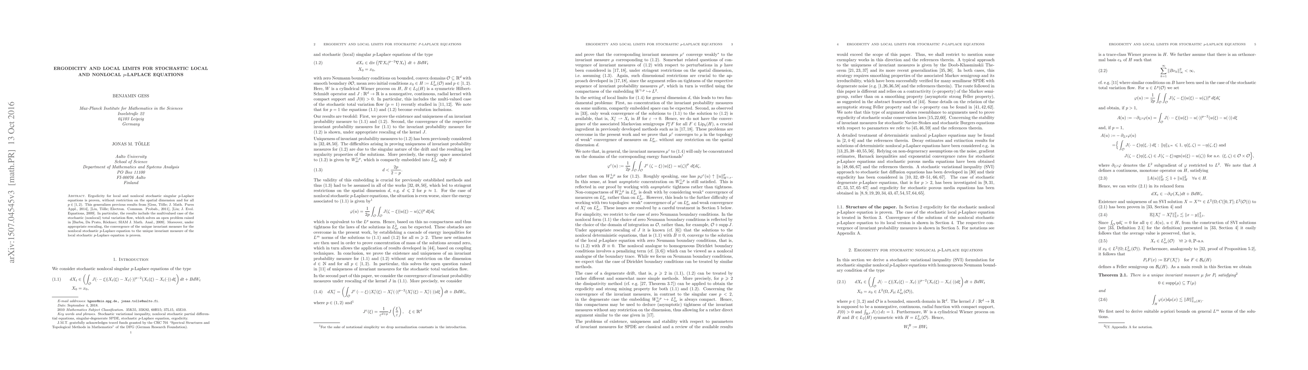 Ergodicity for local and nonlocal stochastic singular $p$-Laplace equations is proven, without restriction on the spatial dimension and for all $p\in[1,2)$. This generalizes previous results from [Gess, T\"{o}lle; J. Math. Pures Appl., 2014], [Liu, T\"{o}lle; Electron. Commun. Probab., 2011], [Liu; J. Evol. Equations, 2009]. In particular, the results include the multivalued case of the stochastic (nonlocal) total variation flow, which solves an open problem raised in [Barbu, Da Prato, R\"{o}ckner; SIAM J. Math. Anal., 2009]. Moreover, under appropriate rescaling, the convergence of the unique invariant measure for the nonlocal stochastic $p$-Laplace equation to the unique invariant measure of the local stochastic $p$-Laplace equation is proven.