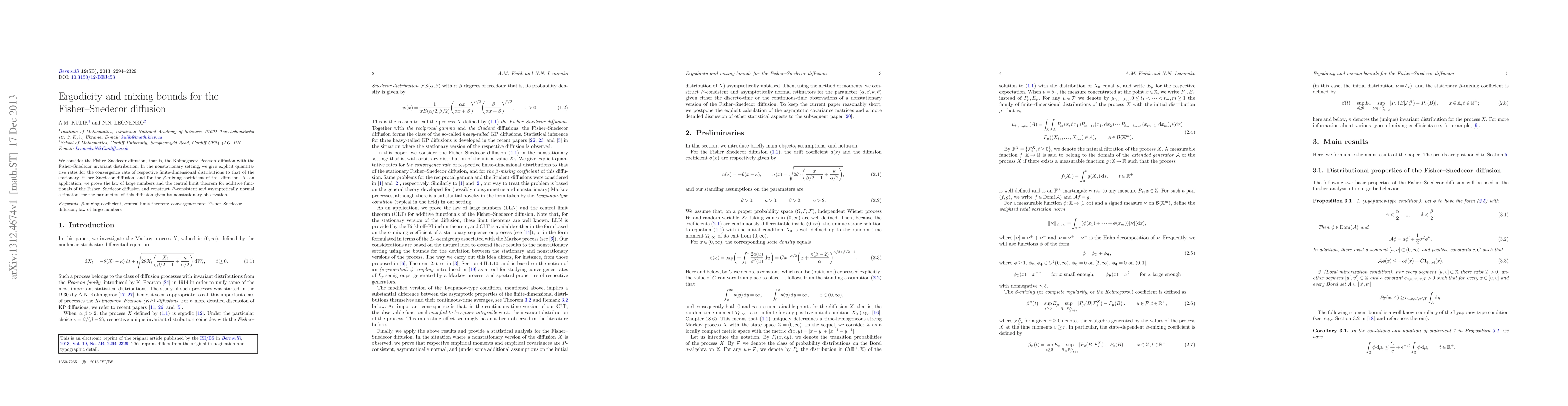 This paper provides explicit convergence rates for the Fisher-Snedecor diffusion to its stationary distribution and $\beta$-mixing bounds. It also establishes the law of large numbers and central limit theorem for its additive functionals, and constructs consistent estimators for its parameters from nonstationary observations.