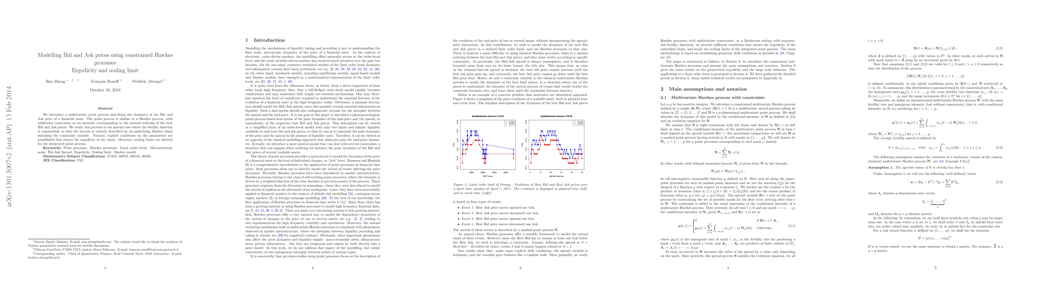 We introduce a multivariate Hawkes process with constraints on its conditional density. It is a multivariate point process with conditional intensity similar to that of a multivariate Hawkes process but certain events are forbidden with respect to boundary conditions on a multidimensional constraint variable, whose evolution is driven by the point process. We study this process in the special case where the fertility function is exponential so that the process is entirely described by an underlying Markov chain, which includes the constraint variable. Some conditions on the parameters are established to ensure the ergodicity of the chain. Moreover, scaling limits are derived for the integrated point process. This study is primarily motivated by the stochastic modelling of a limit order book for high frequency financial data analysis.