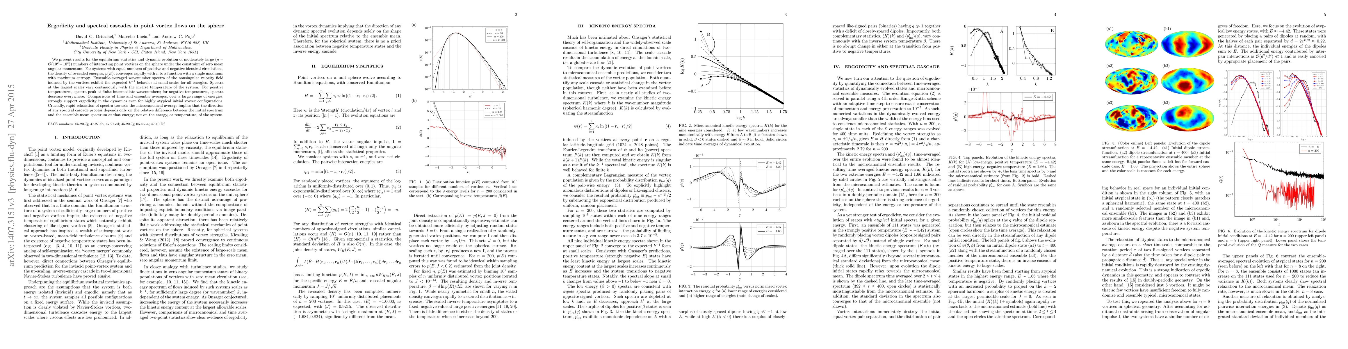 We present results for the equilibrium statistics and dynamic evolution of moderately large ($n = {\mathcal{O}}(10^2 - 10^3)$) numbers of interacting point vortices on the unit sphere under the constraint of zero mean angular momentum. We consider a binary gas consisting of equal numbers of vortices with positive and negative circulations. When the circulations are chosen to be proportional to $1/\sqrt{n}$, the energy probability distribution function, $p(E)$, converges rapidly with $n$ to a function that has a single maximum, corresponding to a maximum in entropy. Ensemble-averaged wavenumber spectra of the nonsingular velocity field induced by the vortices exhibit the expected $k^{-1}$ behavior at small scales for all energies. The spectra at the largest scales vary continuously with the inverse temperature $\beta$ of the system and show a transition from positively sloped to negatively sloped as $\beta$ becomes negative. The dynamics are ergodic and, regardless of the initial configuration of the vortices, statistical measures simply relax towards microcanonical ensemble measures at all observed energies. As such, the direction of any cascade process measured by the evolution of the kinetic energy spectrum depends only on the relative differences between the initial spectrum and the ensemble mean spectrum at that energy; not on the energy, or temperature, of the system.