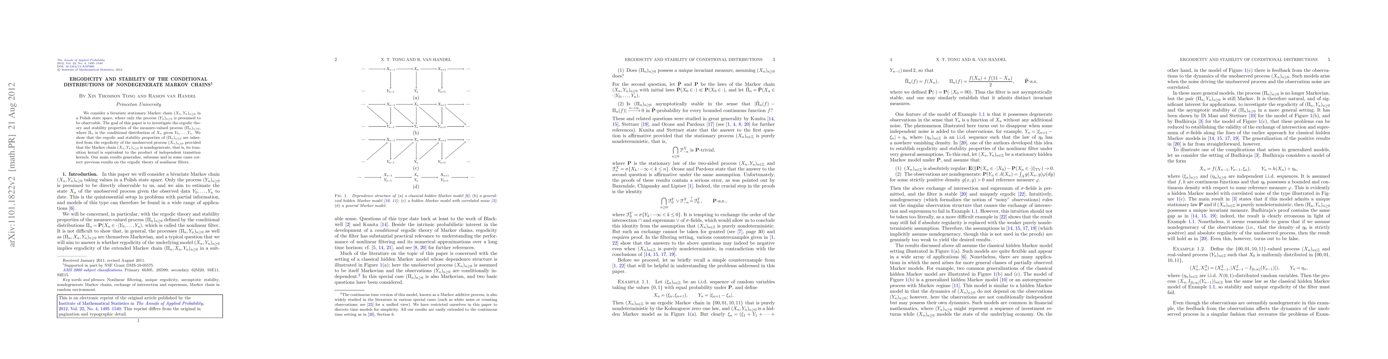 We consider a bivariate stationary Markov chain $(X_n,Y_n)_{n\ge0}$ in a Polish state space, where only the process $(Y_n)_{n\ge0}$ is presumed to be observable. The goal of this paper is to investigate the ergodic theory and stability properties of the measure-valued process $(\Pi_n)_{n\ge0}$, where $\Pi_n$ is the conditional distribution of $X_n$ given $Y_0,...,Y_n$. We show that the ergodic and stability properties of $(\Pi_n)_{n\ge0}$ are inherited from the ergodicity of the unobserved process $(X_n)_{n\ge0}$ provided that the Markov chain $(X_n,Y_n)_{n\ge0}$ is nondegenerate, that is, its transition kernel is equivalent to the product of independent transition kernels. Our main results generalize, subsume and in some cases correct previous results on the ergodic theory of nonlinear filters.