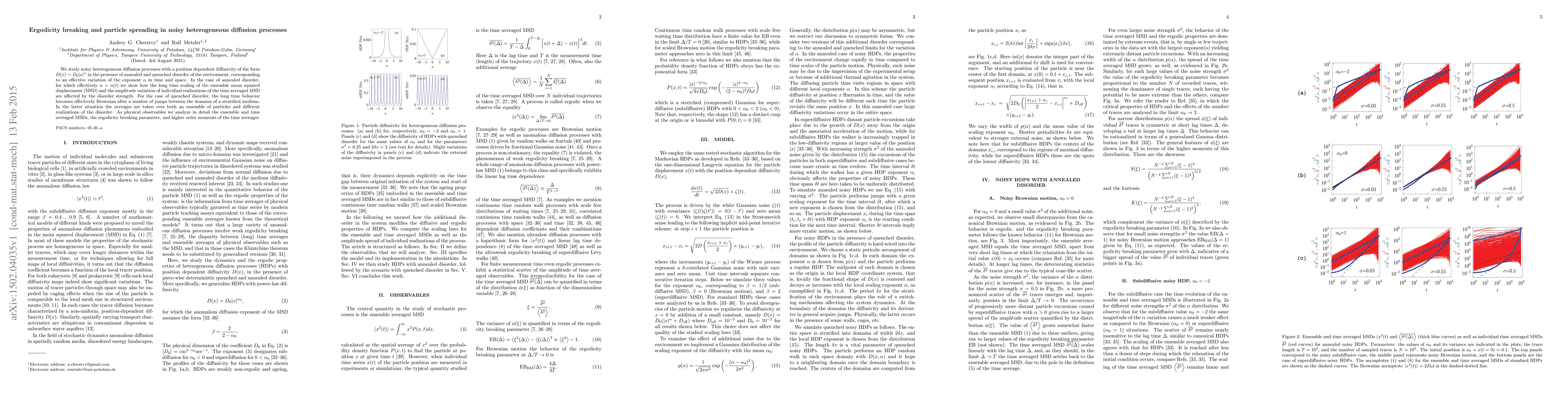 This paper investigates the effects of noisy heterogeneous diffusion processes with position-dependent diffusivity under annealed and quenched disorder. It demonstrates how disorder influences the long-time scaling of the ensemble mean squared displacement and ergodicity breaking, while also showing that quenched disorder leads to effective Brownian behavior after multiple jumps in a stratified medium.