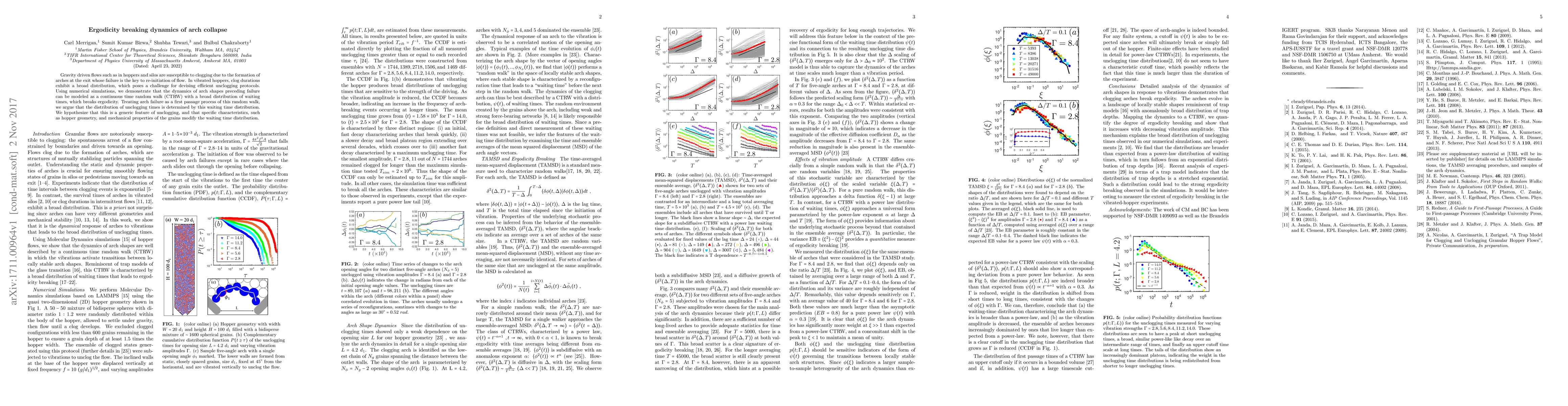 Gravity driven flows such as in hoppers and silos are susceptible to clogging due to the formation of arches at the exit whose failure is the key to re-initiation of flow. In vibrated hoppers, clog durations exhibit a broad distribution, which poses a challenge for devising efficient unclogging protocols. Using numerical simulations, we demonstrate that the dynamics of arch shapes preceding failure can be modeled as a continuous time random walk (CTRW) with a broad distribution of waiting times, which breaks ergodicity. Treating arch failure as a first passage process of this random walk, we argue that the distribution of unclogging times is determined by this waiting time distribution. We hypothesize that this is a generic feature of unclogging, and that specific characteristics, such as hopper geometry, and mechanical properties of the grains modify the waiting time distribution.