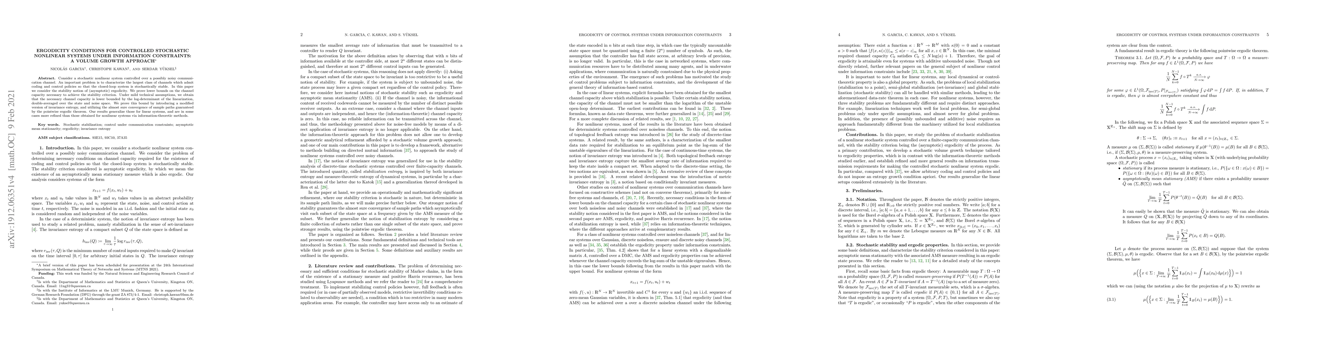 This paper investigates ergodicity conditions for controlled stochastic non-linear systems under communication constraints, proving lower bounds on necessary channel capacity for stability. The study introduces a modified invariance entropy and leverages the pointwise ergodic theorem to generalize stability criteria from linear to nonlinear systems.