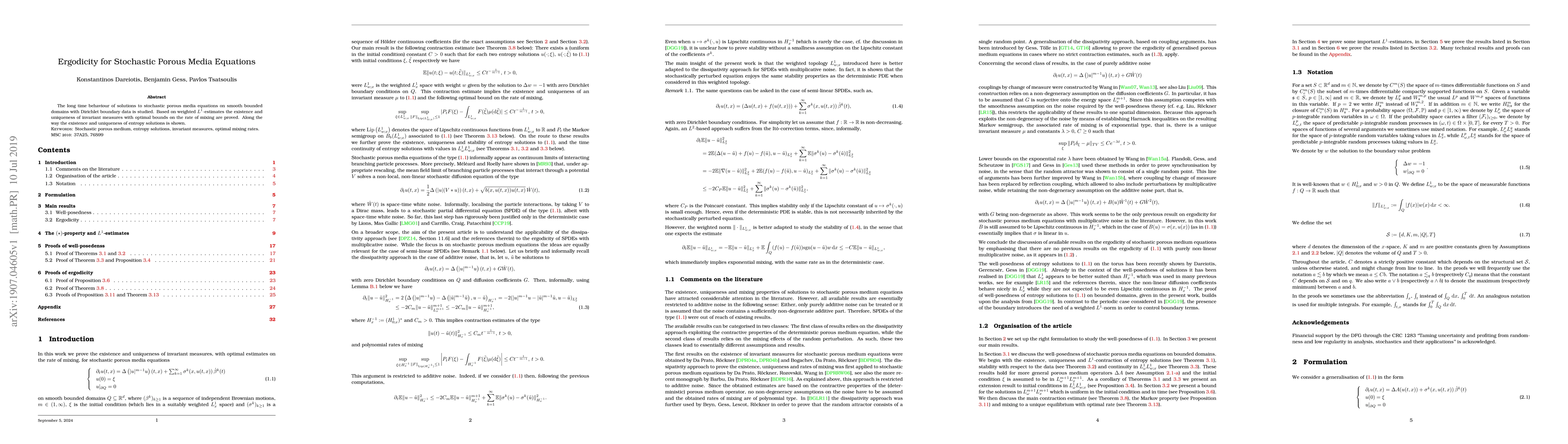 This paper investigates the long-term behavior of stochastic porous media equations, proving the existence and uniqueness of invariant measures with optimal mixing rates, and demonstrating the existence and uniqueness of entropy solutions based on weighted $L^{1}$-estimates.