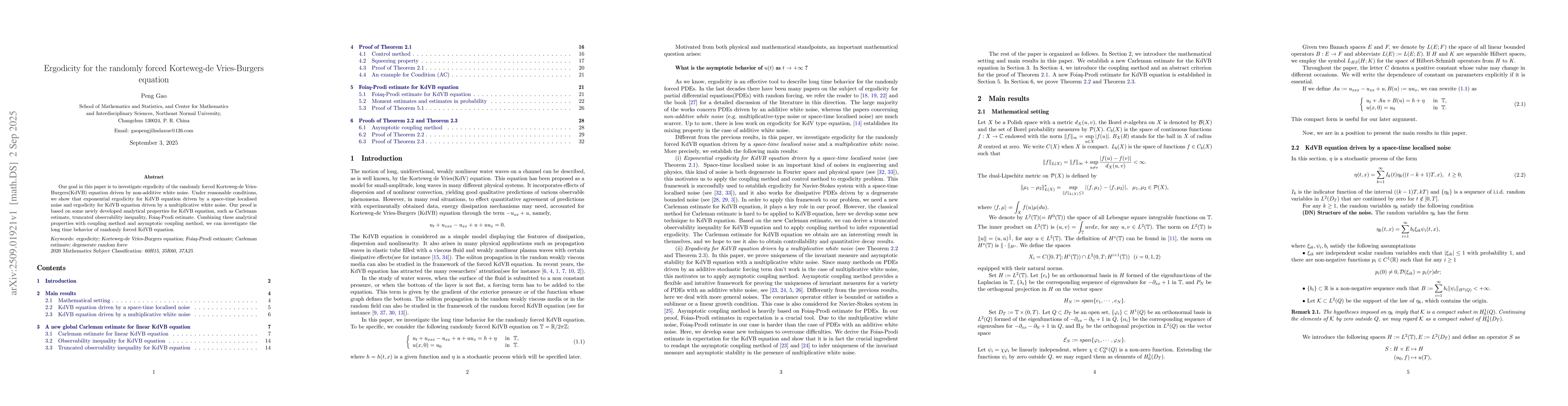 Our goal in this paper is to investigate ergodicity of the randomly forced Korteweg-de Vries-Burgers(KdVB) equation driven by non-additive white noise. Under reasonable conditions, we show that exponential ergodicity for KdVB equation driven by a space-time localised noise and ergodicity for KdVB equation driven by a multiplicative white noise. Our proof is based on some newly developed analytical properties for KdVB equation, such as Carleman estimate, truncated observability inequality, Foia\c{s}-Prodi estimate. Combining these analytical properties with coupling method and asymptotic coupling method, we can investigate the long time behavior of randomly forced KdVB equation.