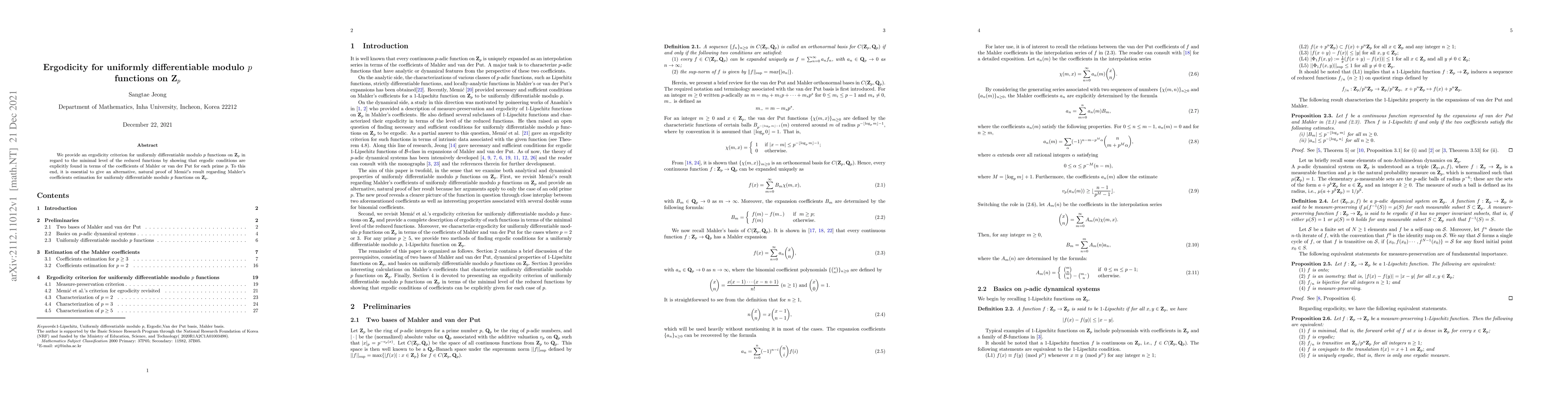 Researchers provide a criterion for determining ergodicity in uniformly differentiable modulo p functions on Z_p, linking it to Mahler or van der Put coefficients for prime p. The study offers an alternative proof for estimating these coefficients.