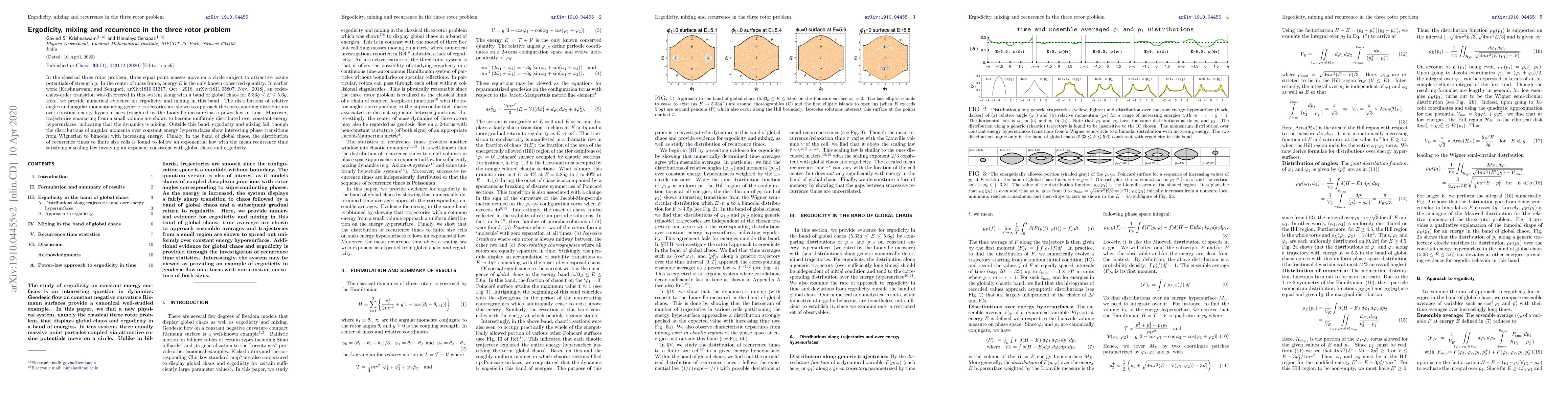 In the classical three rotor problem, three equal point masses move on a circle subject to attractive cosine potentials of strength g. In the center of mass frame, energy E is the only known conserved quantity. In earlier work [Krishnaswami and Senapati, arXiv:1810.01317, Oct. 2018, arXiv:1811.05807, Nov. 2018], an order-chaos-order transition was discovered in this system along with a band of global chaos for 5.33g < E < 5.6g. Here, we provide numerical evidence for ergodicity and mixing in this band. The distributions of relative angles and angular momenta along generic trajectories are shown to approach the corresponding distributions over constant energy hypersurfaces (weighted by the Liouville measure) as a power-law in time. Moreover, trajectories emanating from a small volume are shown to become uniformly distributed over constant energy hypersurfaces, indicating that the dynamics is mixing. Outside this band, ergodicity and mixing fail, though the distributions of angular momenta over constant energy hypersurfaces show interesting phase transitions from Wignerian to bimodal with increasing energy. Finally, in the band of global chaos, the distribution of recurrence times to finite size cells is found to follow an exponential law with the mean recurrence time satisfying a scaling law involving an exponent consistent with global chaos and ergodicity.