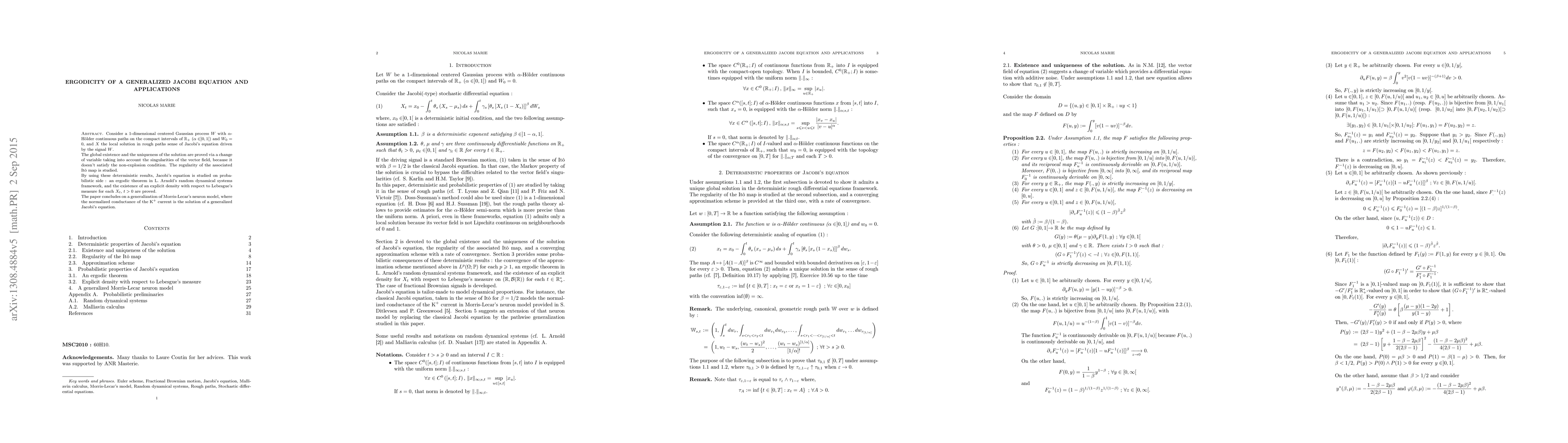 This research paper investigates the ergodicity of a generalized Jacobi's equation, proving global existence, uniqueness, and explicit density for its solutions in both deterministic and probabilistic frameworks, with applications to Morris-Lecar's neuron model.