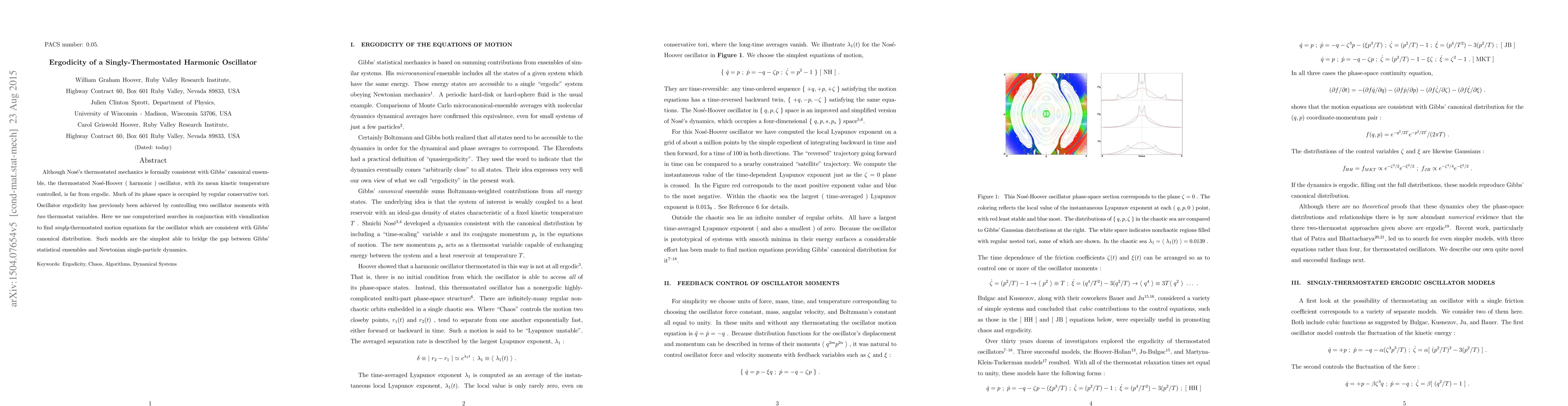Although Nose's thermostated mechanics is formally consistent with Gibbs' canonical ensemble, the thermostated Nose-Hoover ( harmonic ) oscillator, with its mean kinetic temperature controlled, is far from ergodic. Much of its phase space is occupied by regular conservative tori. Oscillator ergodicity has previously been achieved by controlling two oscillator moments with two thermostat variables. Here we use computerized searches in conjunction with visualization to find singly-thermostated motion equations for the oscillator which are consistent with Gibbs' canonical distribution. These models are the simplest able to bridge the gap between Gibbs' statistical ensembles and Newtonian single-particle dynamics.