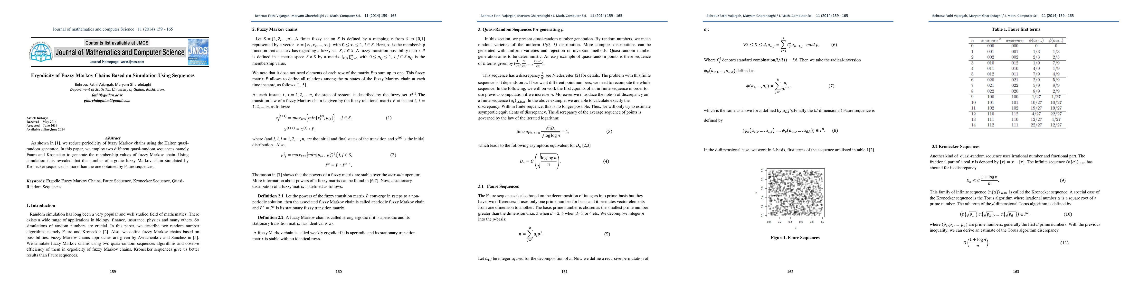As shown in [1], we reduce periodicity of fuzzy Markov chains using the Halton quasi-random generator. In this paper, we employ two different quasi-random sequences namely Faure and Kronecker to generate the membership values of fuzzy Markov chain. Using simulation it is revealed that the number of ergodic fuzzy Markov chain simulated by Kronecker sequences is more than the one obtained by Faure sequences.