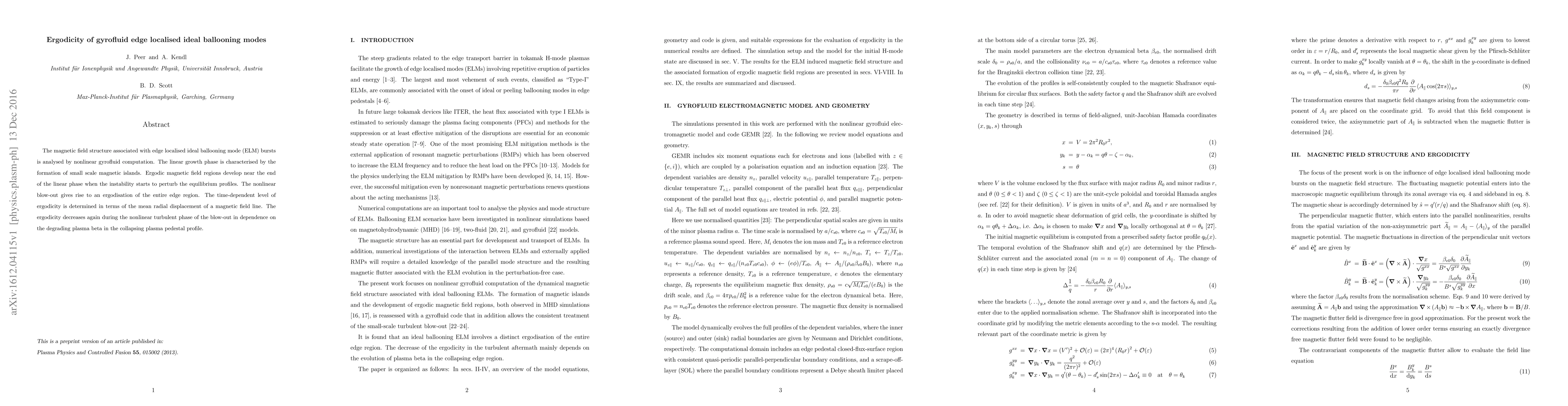 This paper investigates the ergodicity of edge localised ideal ballooning modes in gyrofluid simulations, finding that ergodic magnetic field regions form near the end of the linear growth phase and persist through the nonlinear blow-out, though they diminish during the turbulent phase due to changes in plasma beta.