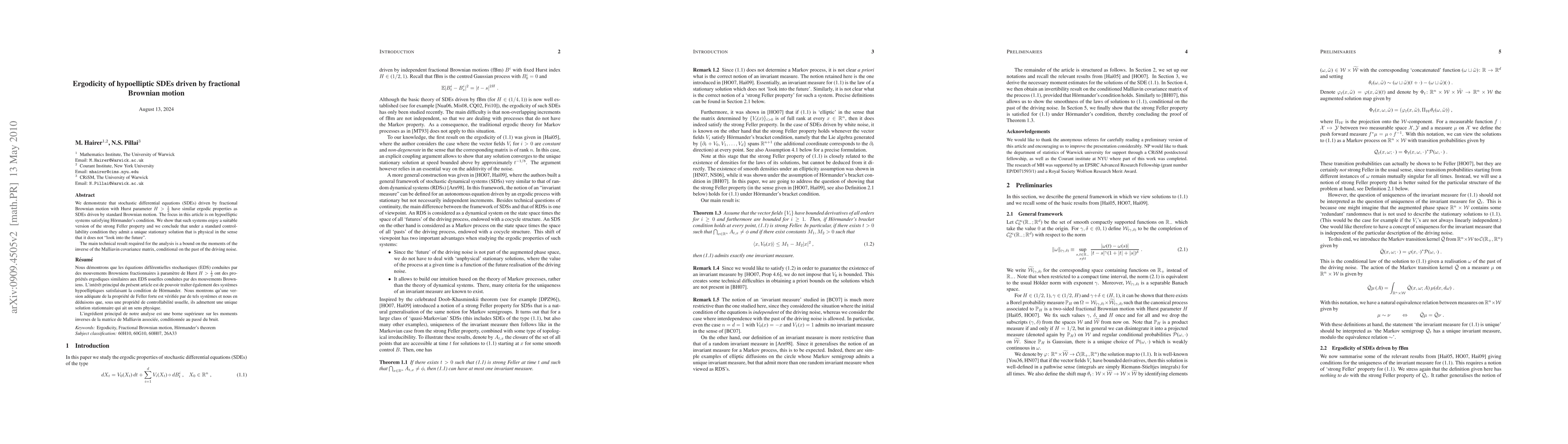 This paper proves that hypoelliptic stochastic differential equations (SDEs) driven by fractional Brownian motion with Hurst parameter \(H > 1/2\) exhibit ergodic properties similar to those driven by standard Brownian motion, establishing a strong Feller property and a unique stationary solution without future dependence. The analysis hinges on a bound for the moments of the inverse of the Malliavin covariance matrix.