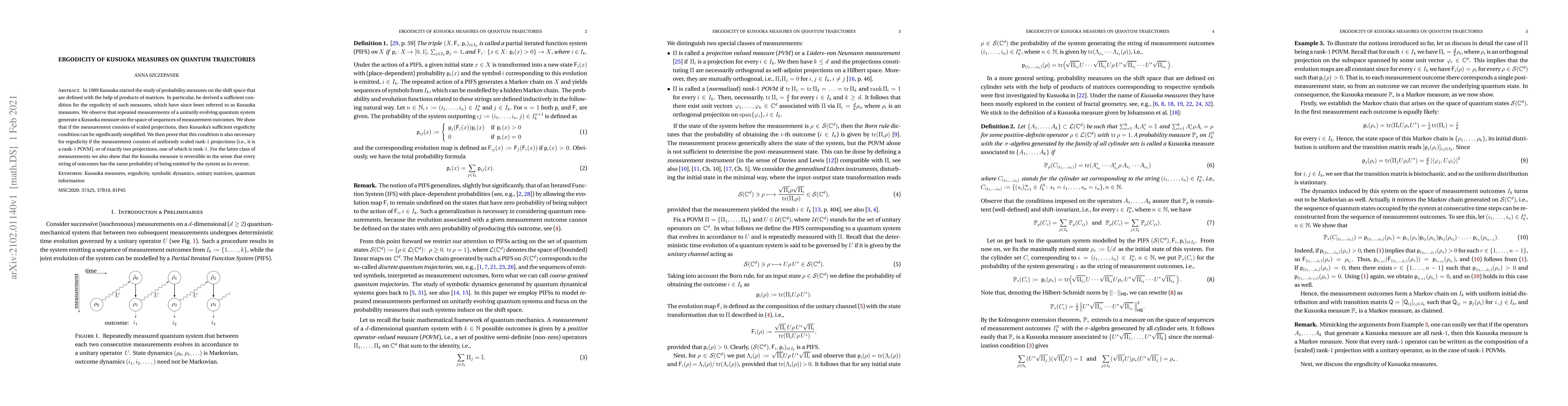 In 1989 Kusuoka started the study of probability measures on the shift space that are defined with the help of products of matrices. In particular, he derived a sufficient condition for the ergodicity of such measures, which have since been referred to as Kusuoka measures. We observe that repeated measurements of a unitarily evolving quantum system generate a Kusuoka measure on the space of sequences of measurement outcomes. We show that if the measurement consists of scaled projections, then Kusuoka's sufficient ergodicity condition can be significantly simplified. We then prove that this condition is also necessary for ergodicity if the measurement consists of uniformly scaled rank-1 projections (i.e., it is a rank-1 POVM), or of exactly two projections, one of which is rank-1. For the latter class of measurements we also show that the Kusuoka measure is reversible in the sense that every string of outcomes has the same probability of being emitted by the system as its reverse.