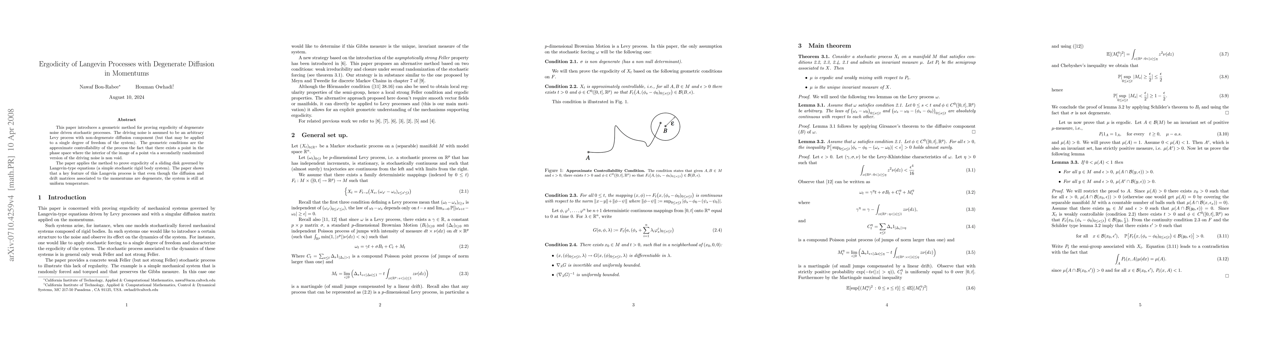 This paper introduces a geometric method for proving ergodicity of degenerate noise driven stochastic processes. The driving noise is assumed to be an arbitrary Levy process with non-degenerate diffusion component (but that may be applied to a single degree of freedom of the system). The geometric conditions are the approximate controllability of the process the fact that there exists a point in the phase space where the interior of the image of a point via a secondarily randomized version of the driving noise is non void. The paper applies the method to prove ergodicity of a sliding disk governed by Langevin-type equations (a simple stochastic rigid body system). The paper shows that a key feature of this Langevin process is that even though the diffusion and drift matrices associated to the momentums are degenerate, the system is still at uniform temperature.