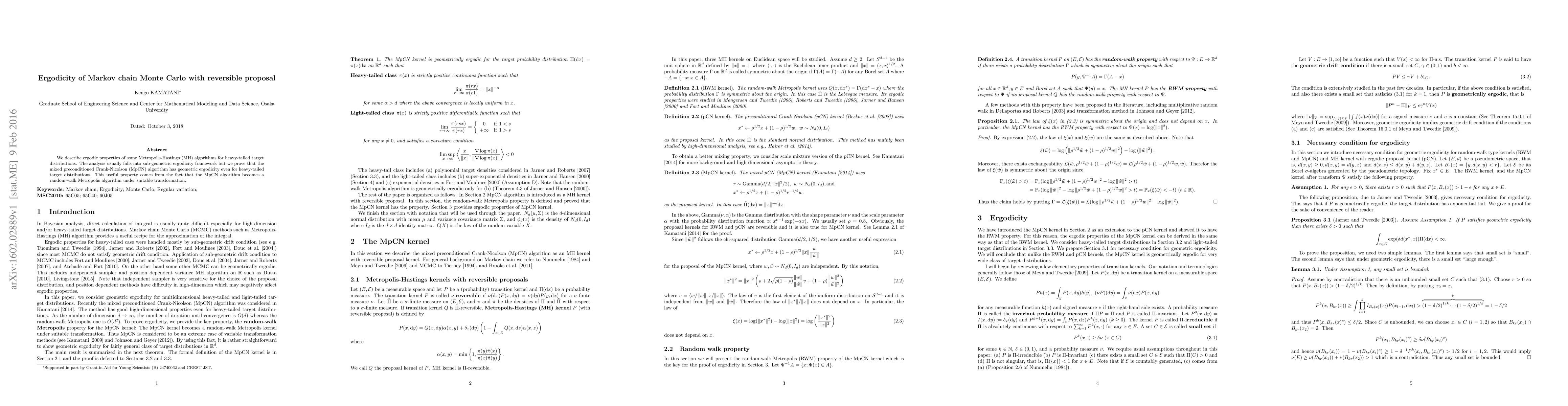 We describe ergodic properties of some Metropolis-Hastings (MH) algorithms for heavy-tailed target distributions. The analysis usually falls into sub-geometric ergodicity framework but we prove that the mixed preconditioned Crank-Nicolson (MpCN) algorithm has geometric ergodicity even for heavy-tailed target distributions. This useful property comes from the fact that the MpCN algorithm becomes a random-walk Metropolis algorithm under suitable transformation.