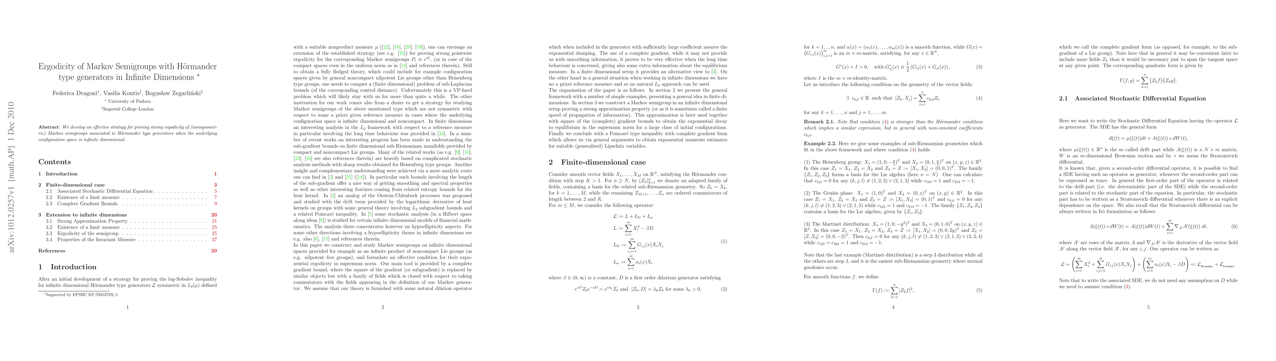 We develop an effective strategy for proving strong ergodicity of (nonsymmetric) Markov semigroups associated to H\"ormander type generators when the underlying configuration space is infinite dimensional.