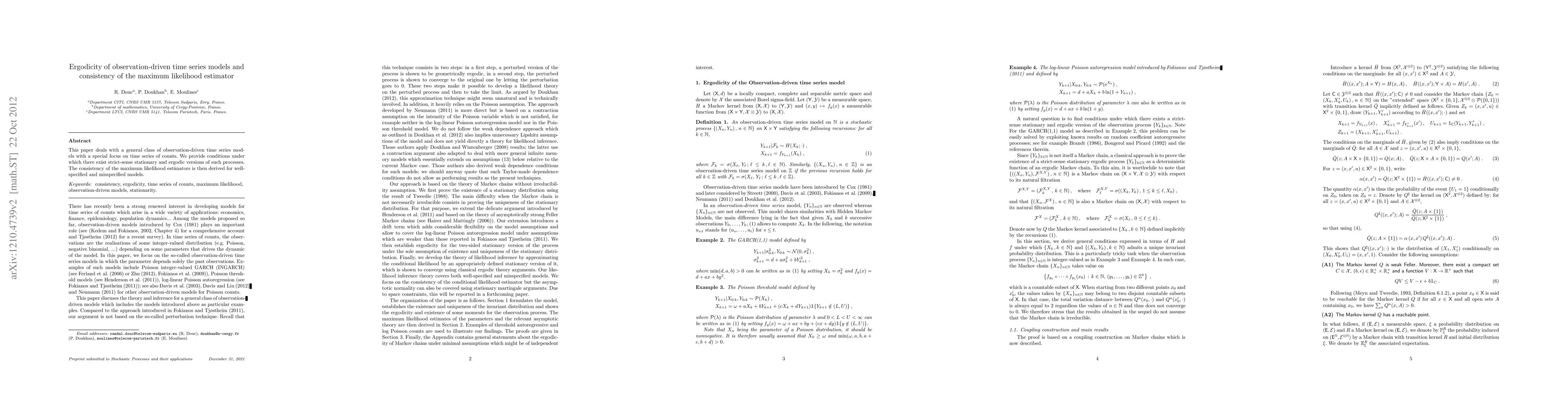 This paper investigates observation-driven time series models, particularly for count data, establishing conditions for their ergodicity and deriving the consistency of maximum likelihood estimators for both well-specified and misspecified models.