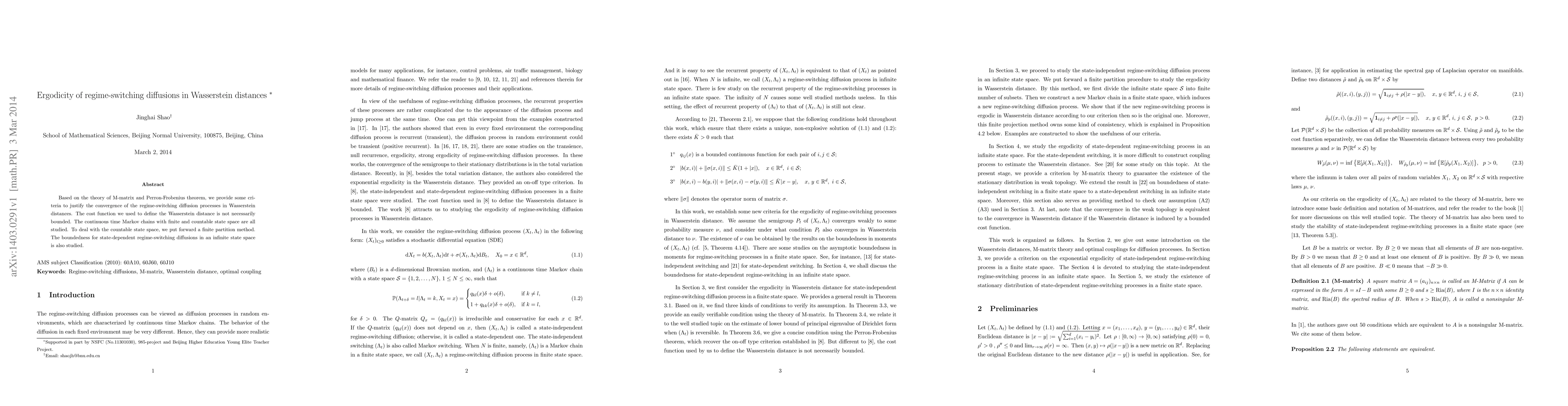 This paper establishes criteria for the ergodicity of regime-switching diffusion processes using M-matrix theory and the Perron-Frobenius theorem, focusing on convergence in Wasserstein distances. It introduces a finite partition method for handling countable state spaces and explores boundedness for regime-switching diffusions in infinite state spaces.