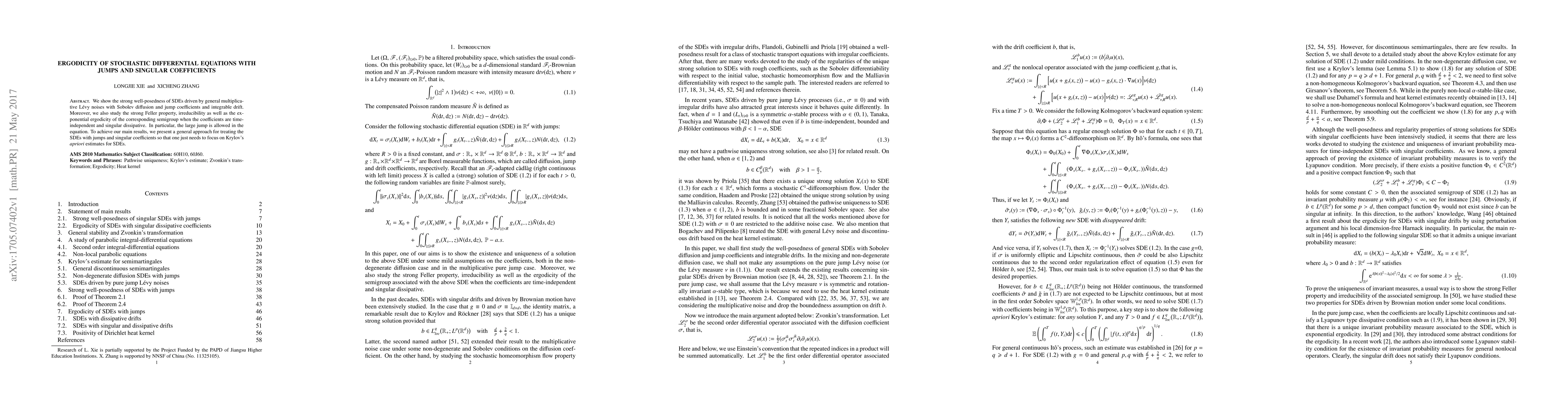 We show the strong well-posedness of SDEs driven by general multiplicative L\'evy noises with Sobolev diffusion and jump coefficients and integrable drift. Moreover, we also study the strong Feller property, irreducibility as well as the exponential ergodicity of the corresponding semigroup when the coefficients are time-independent and singular dissipative. In particular, the large jump is allowed in the equation. To achieve our main results, we present a general approach for treating the SDEs with jumps and singular coefficients so that one just needs to focus on Krylov's {\it apriori} estimates for SDEs.