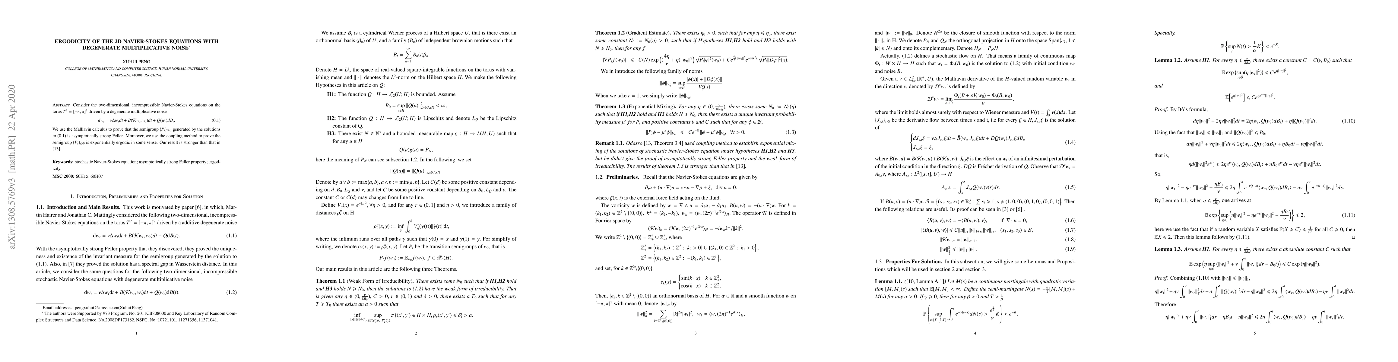 Summary: This paper proves the asymptotic strong Feller property and exponential ergodicity of the semigroup generated by solutions to stochastic 2D Navier-Stokes equations with degenerate multiplicative noise on the torus.