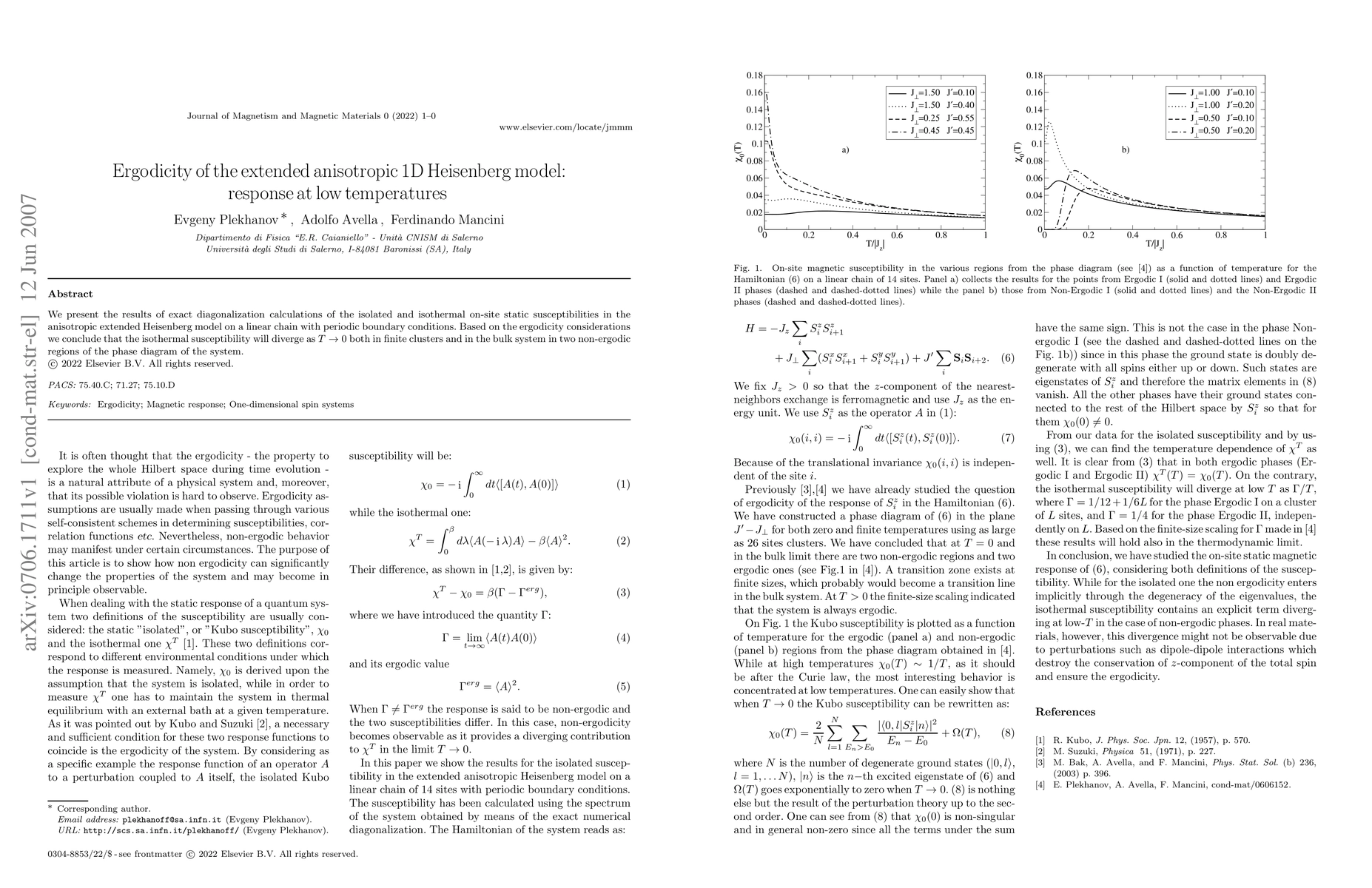 We present the results of exact diagonalization calculations of the isolated and isothermal on-site static susceptibilities in the anisotropic extended Heisenberg model on a linear chain with periodic boundary conditions. Based on the ergodicity considerations we conclude that the isothermal susceptibility will diverge as $T\to 0$ both in finite clusters and in the bulk system in two non-ergodic regions of the phase diagram of the system.