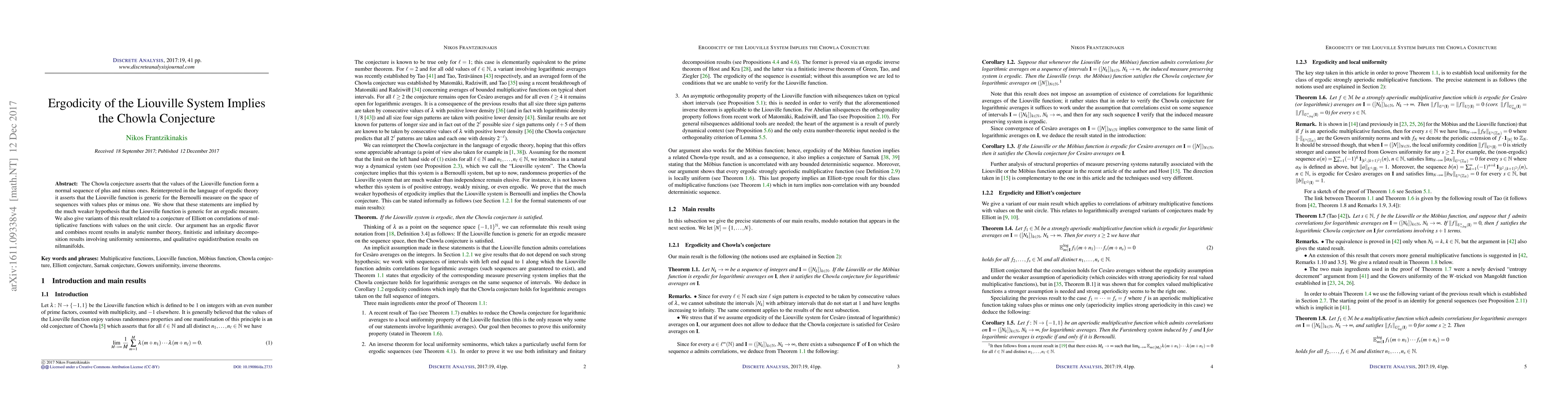 The Chowla conjecture asserts that the values of the Liouville function form a normal sequence of plus and minus ones. Reinterpreted in the language of ergodic theory it asserts that the Liouville function is generic for the Bernoulli measure on the space of sequences with values plus or minus one. We show that these statements are implied by the much weaker hypothesis that the Liouville function is generic for an ergodic measure. We also give variants of this result related to a conjecture of Elliott on correlations of multiplicative functions with values on the unit circle. Our argument has an ergodic flavor and combines recent results in analytic number theory, finitistic and infinitary decomposition results involving uniformity seminorms, and qualitative equidistribution results on nilmanifolds.