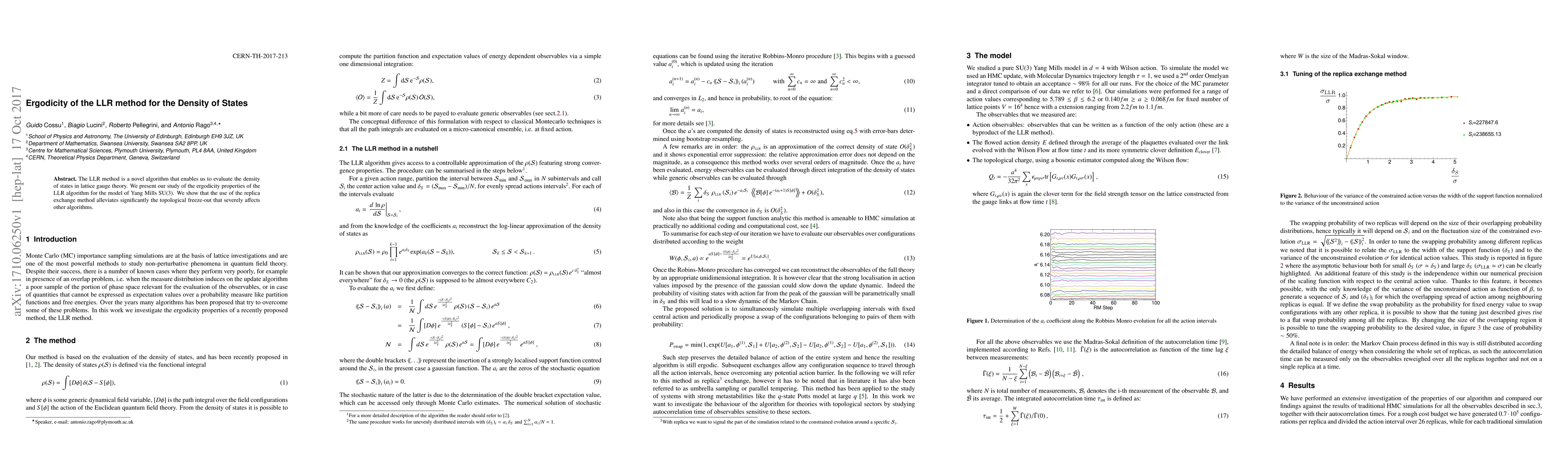 The LLR method is a novel algorithm that enables us to evaluate the density of states in lattice gauge theory. We present our study of the ergodicity properties of the LLR algorithm for the model of Yang Mills SU(3). We show that the use of the replica exchange method alleviates significantly the topological freeze-out that severely affects other algorithms.
