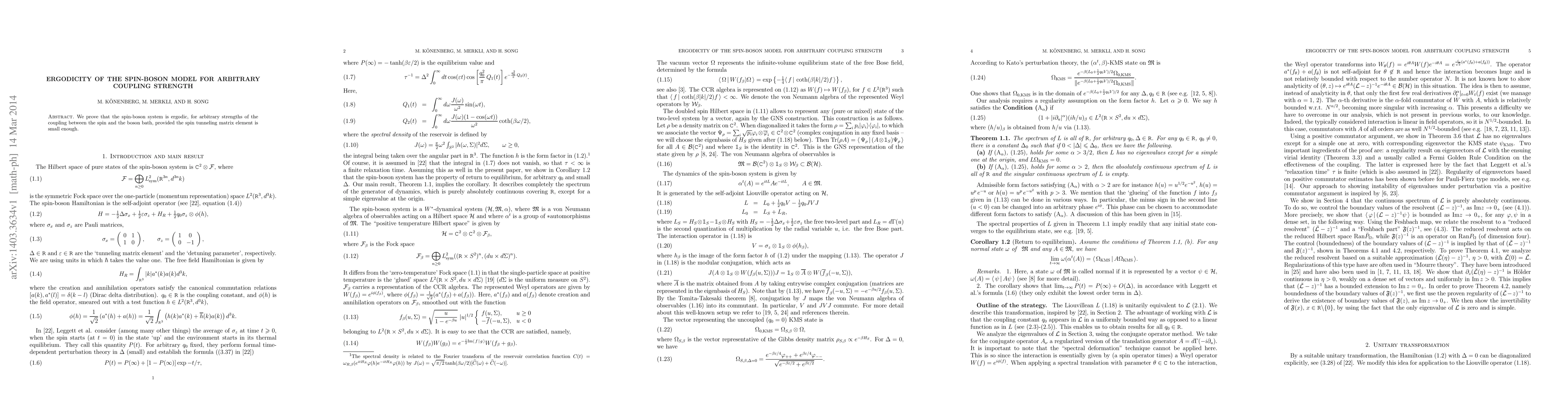 Summary: This paper demonstrates the ergodicity of the spin-boson model for any coupling strength, given that the spin tunneling matrix element is sufficiently small. Ergodicity is shown to hold under these conditions, regardless of the coupling strength.