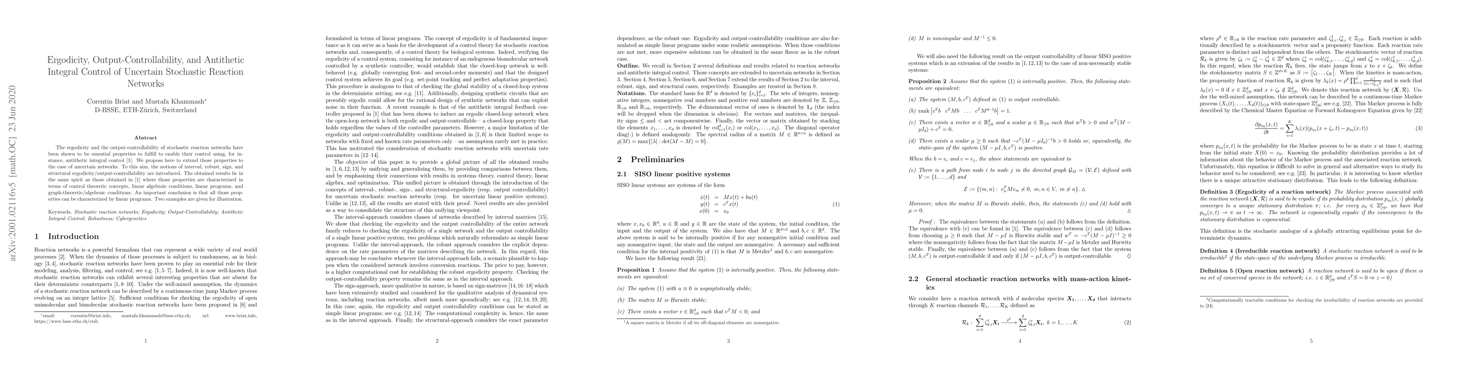 The ergodicity and the output-controllability of stochastic reaction networks have been shown to be essential properties to fulfill to enable their control using, for instance, antithetic integral control. We propose here to extend those properties to the case of uncertain networks. To this aim, the notions of interval, robust, sign, and structural ergodicity/output-controllability are introduced. The obtained results lie in the same spirit as those obtained in [Briat, Gupta & Khammash, Cell Systems, 2016] where those properties are characterized in terms of control theoretic concepts, linear algebraic conditions, linear programs, and graph-theoretic/algebraic conditions. An important conclusion is that all those properties can be characterized by linear programs. Two examples are given for illustration.
