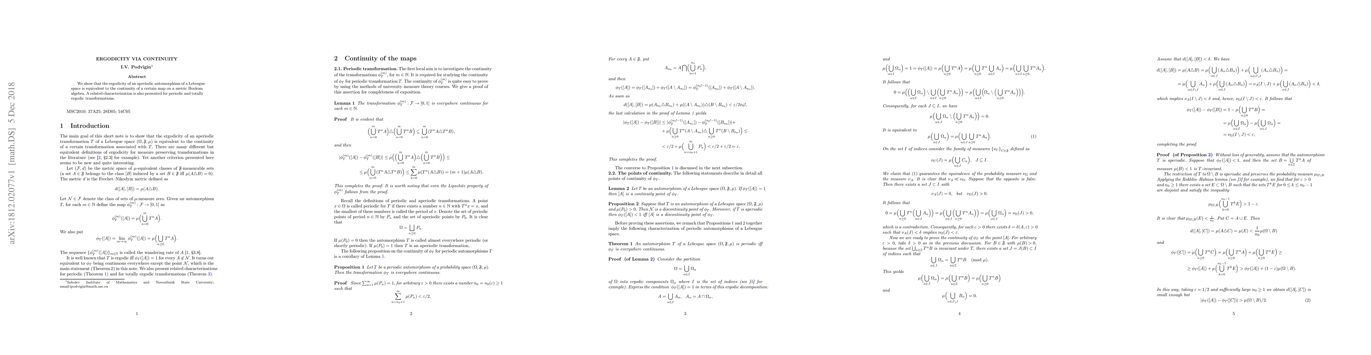 We show that the ergodicity of an aperiodic automorphism of a Lebesgue space is equivalent to the continuity of a certain map on a metric Boolean algebra. A related characterization is also presented for periodic and totally ergodic transformations